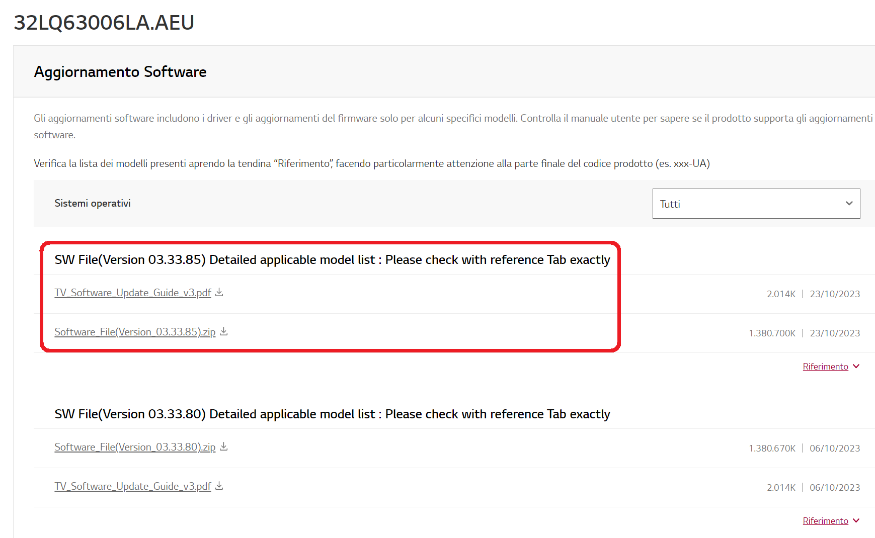Cercate la versione più recente rispetto a quella installata (es.: 03.33.85 vs 03.33.80 – vedi sopra) e cliccate sulla voce “Aggiornamento software” o “Software File” (es.: Software_File_Version_03.33.85.zip per scaricare il file zippato contenente il nuovo software).
