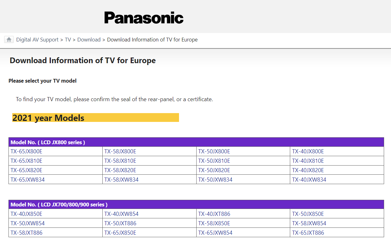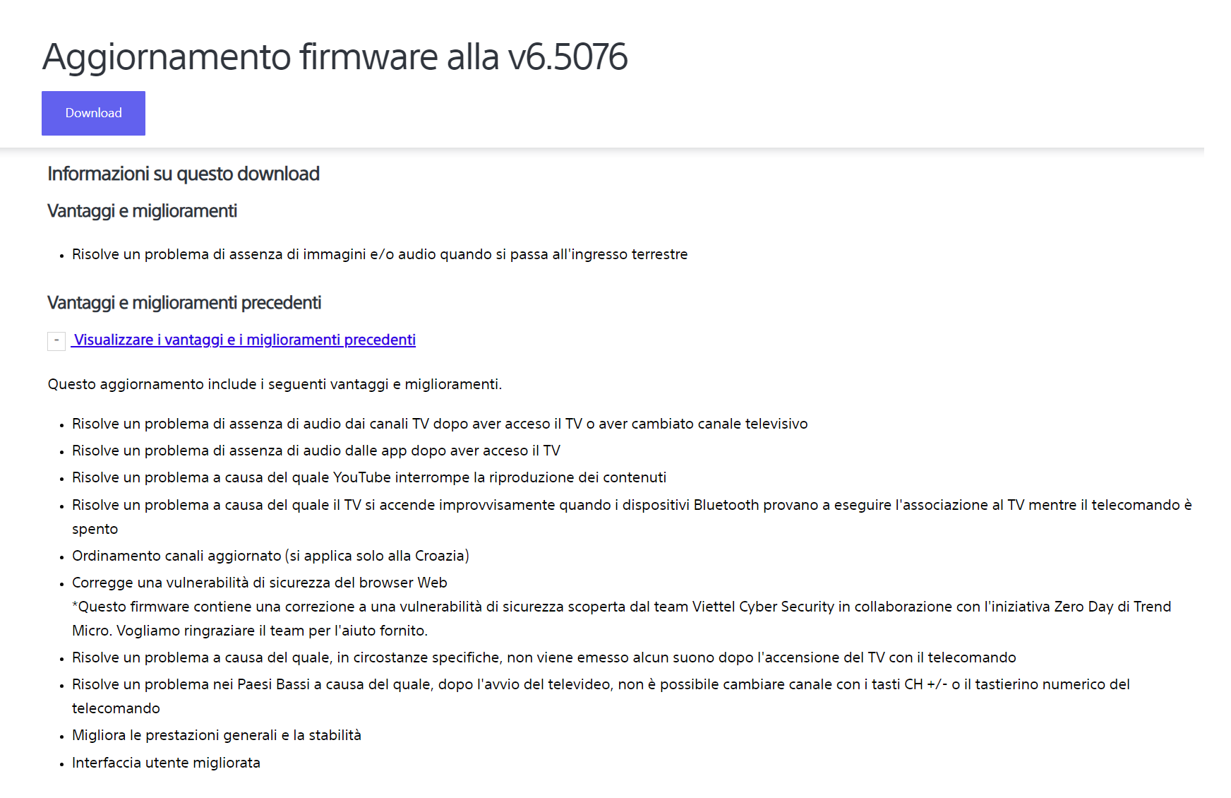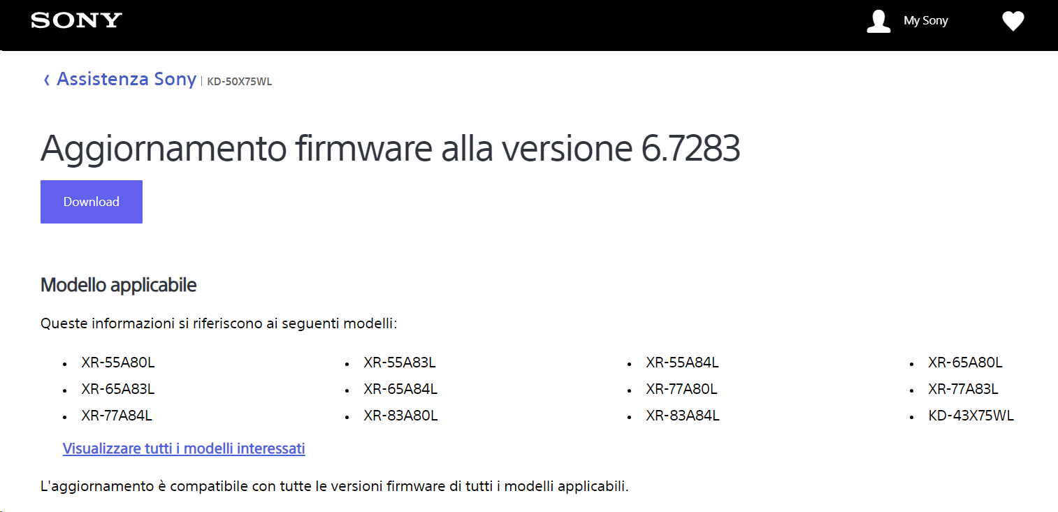 Prendete nota della versione, accendete il PC (Windows, Mac o altro) e visitate il sito web del produttore (es.: Sony, Panasonic, LG, Samsung, ecc.). Di solito i software sono disponibili nelle sezioni “Assistenza”, “Downloads” o “Software e Driver” e suddivisi per codice modello o tipologia di prodotto.