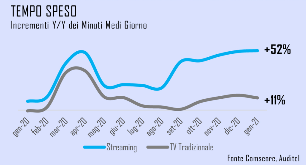Il 2021 si è aperto con un trend in linea con i mesi precedenti e, sul tempo medio per persona di gennaio, si rileva un + 52% anno sul video digitale a fronte di un + 11% della TV tradizionale.