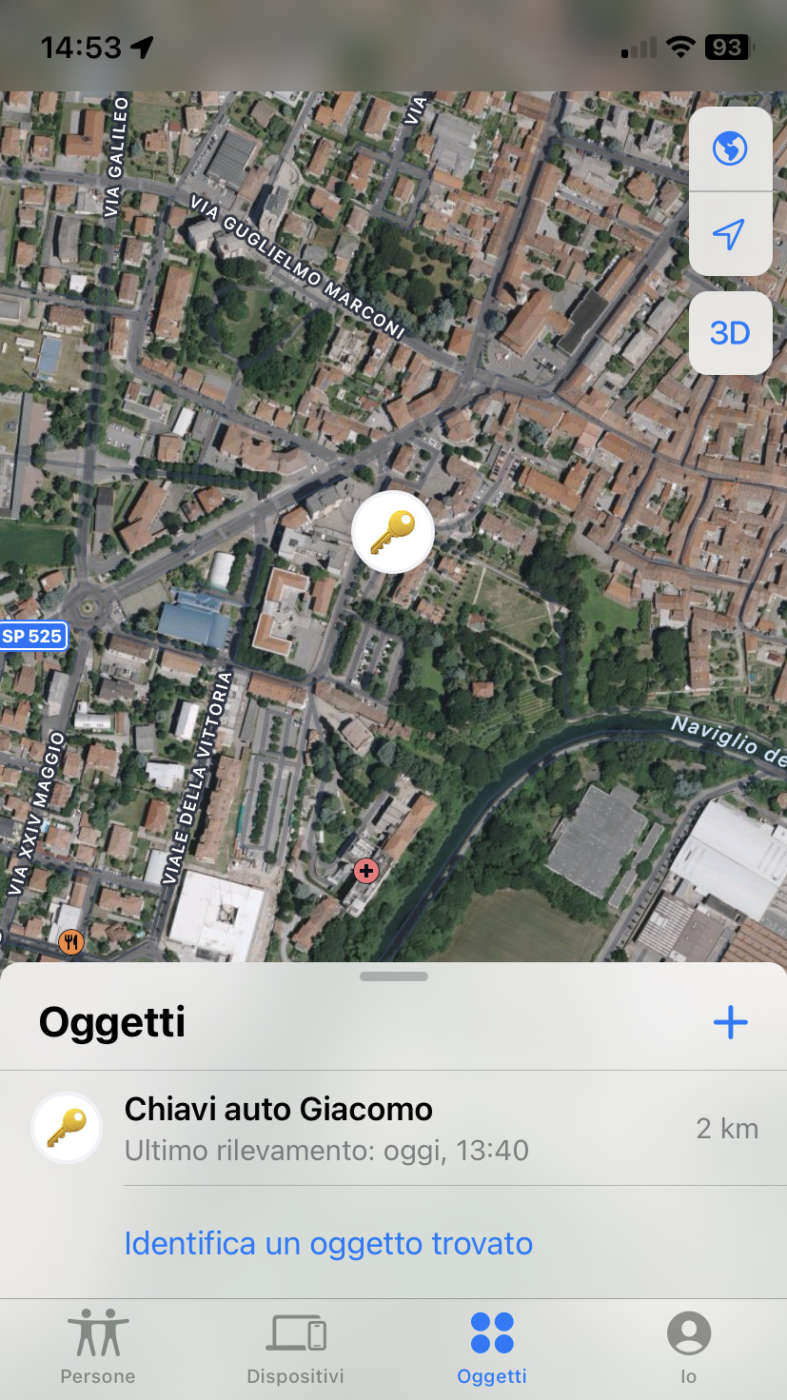 L’AirTag che avete appena abbinato al vostro iPhone è accessibile sempre dal pannello Oggetti di Dov’è insieme alla mappa con la posizione (es.: Casa, 2 km, ecc.) e la data dell’ultima localizzazione (es.: giorno e ora).