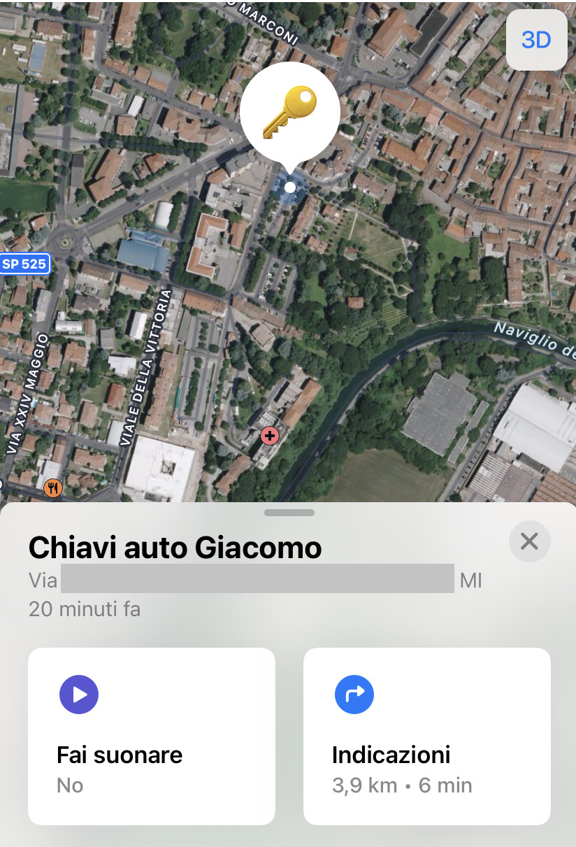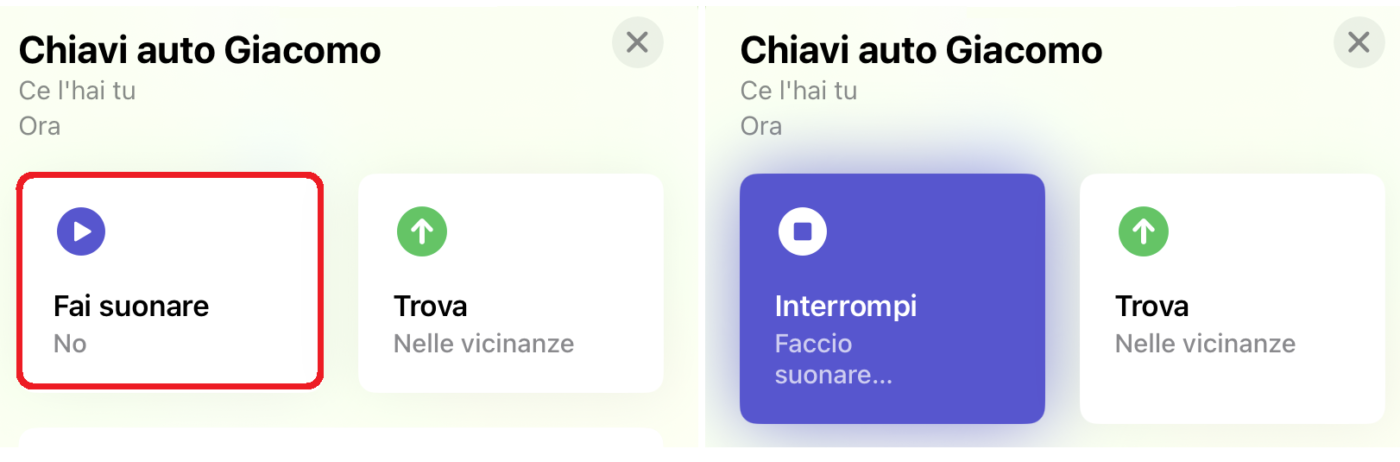 Se l’AirTag si trova nel raggio d’azione del collegamento Bluetooth (fino 50-70 metri di distanza da voi) potete far suonare il suo cicalino e ascoltare da dove proviene, ad esempio da sotto i cuscini del divano, dalla tasca del giubbotto, ecc.