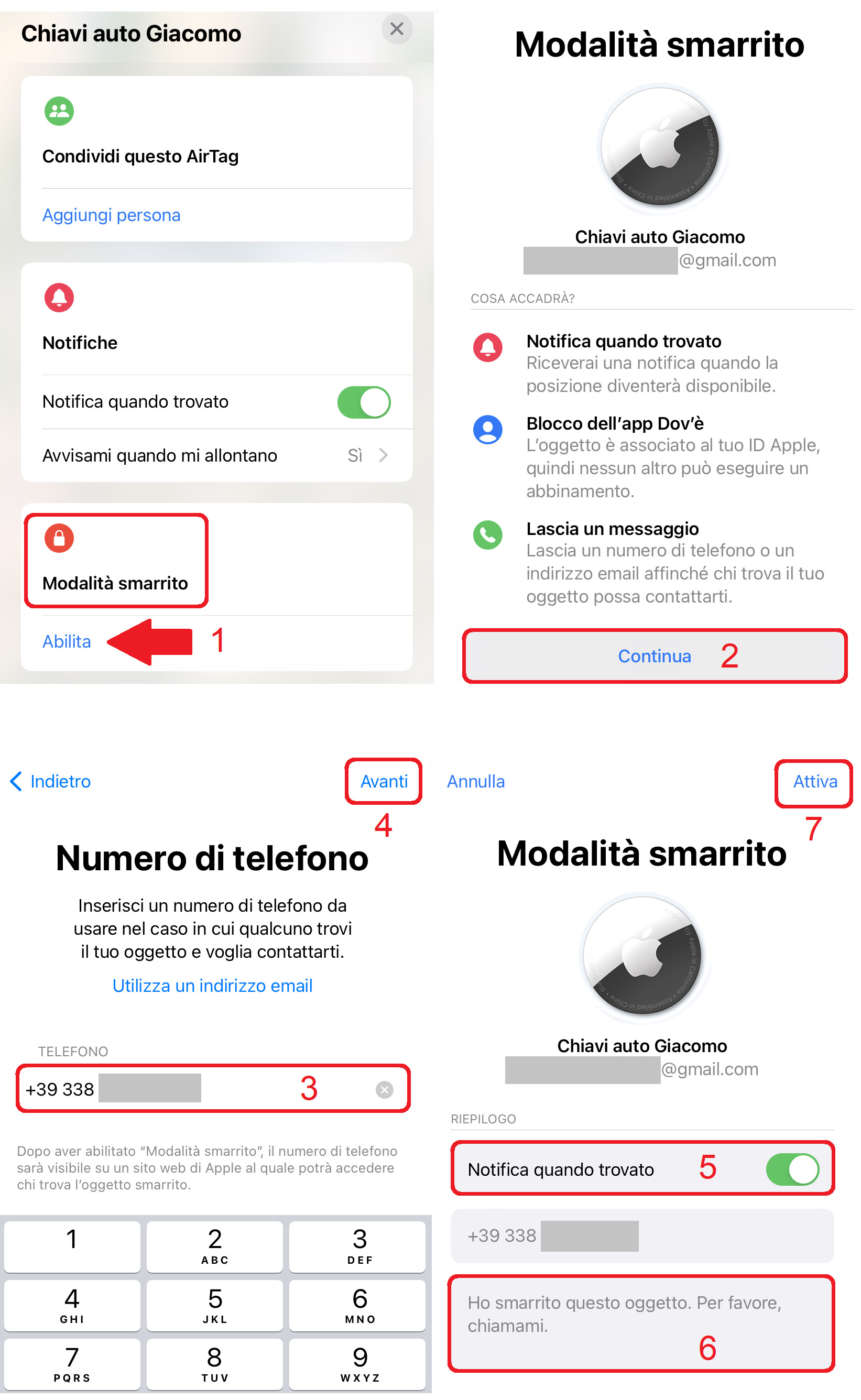 Se il vostro AirTag è al momento irrintracciabile dovete attivare subito la Modalità smarrito indicando il vostro numero di telefono (o mail) e inserendo un messaggio personalizzato.