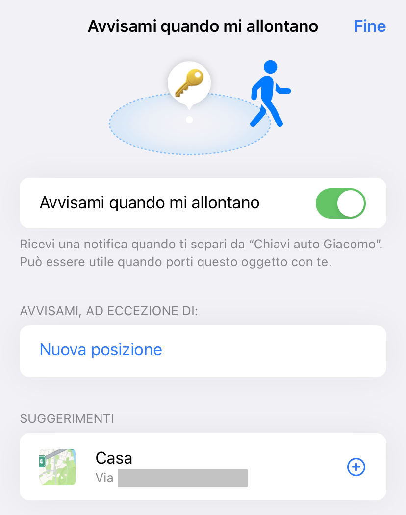 Basta spuntare la casella Avvisami quando mi allontano e, se necessario, indicare una o più posizioni sicure (es.: casa) dove lasciare l’AirTag senza ricevere l’avviso. Al termine cliccare su Fine.