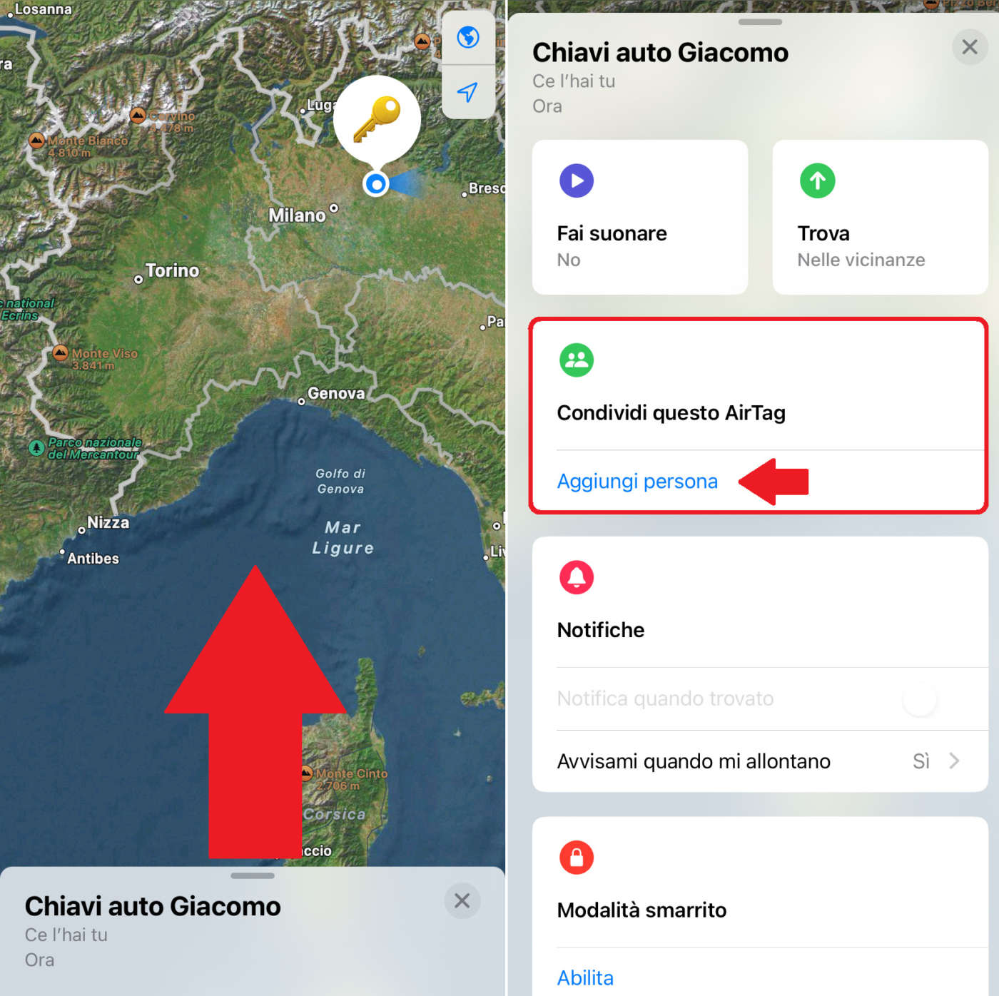 Se prestate il vostro AirTag ad un amico o familiare senza prima condividerlo riceverà un avviso di AirTag sconosciuto nelle vicinanze con notifiche di tracciamento per ragioni di sicurezza (es.: anti-stalking) come spiegato in questo articolo.