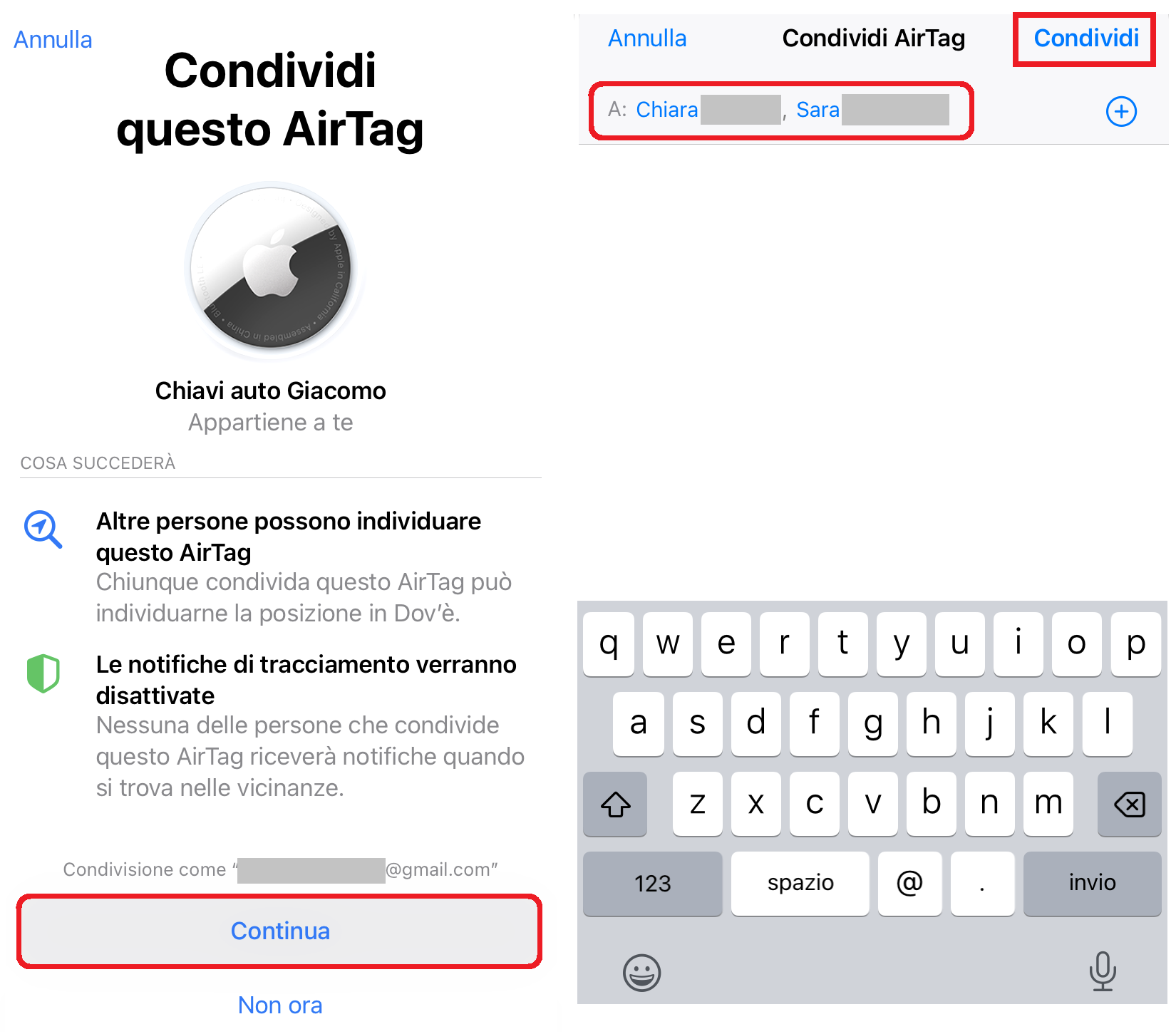 1. Leggere attentamente le avvertenze, cliccare su Continua, digitare i nomi delle persone (oppure l’ID Apple) con le quali si vuole condividere l’AirTag e cliccare su Condividere;