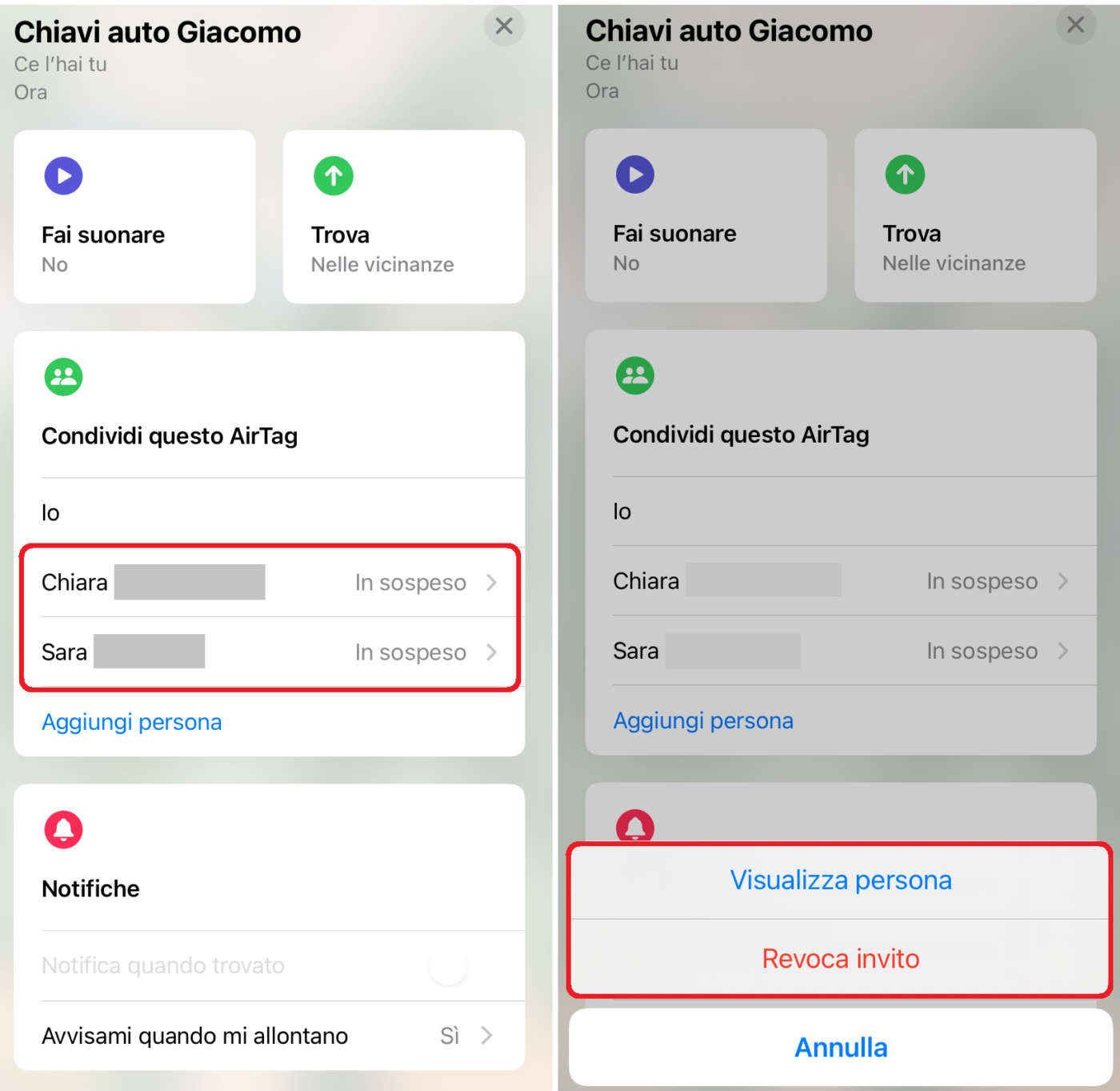1. Nella finestra Condividi questo AirTag compariranno i nomi delle persone che potranno utilizzarlo con lo stato della richiesta (es.: in sospeso). Cliccando su ciascun nome potrete visualizzare la posizione del suo iPhone (se condivisa con voi) e revocare l’invito;