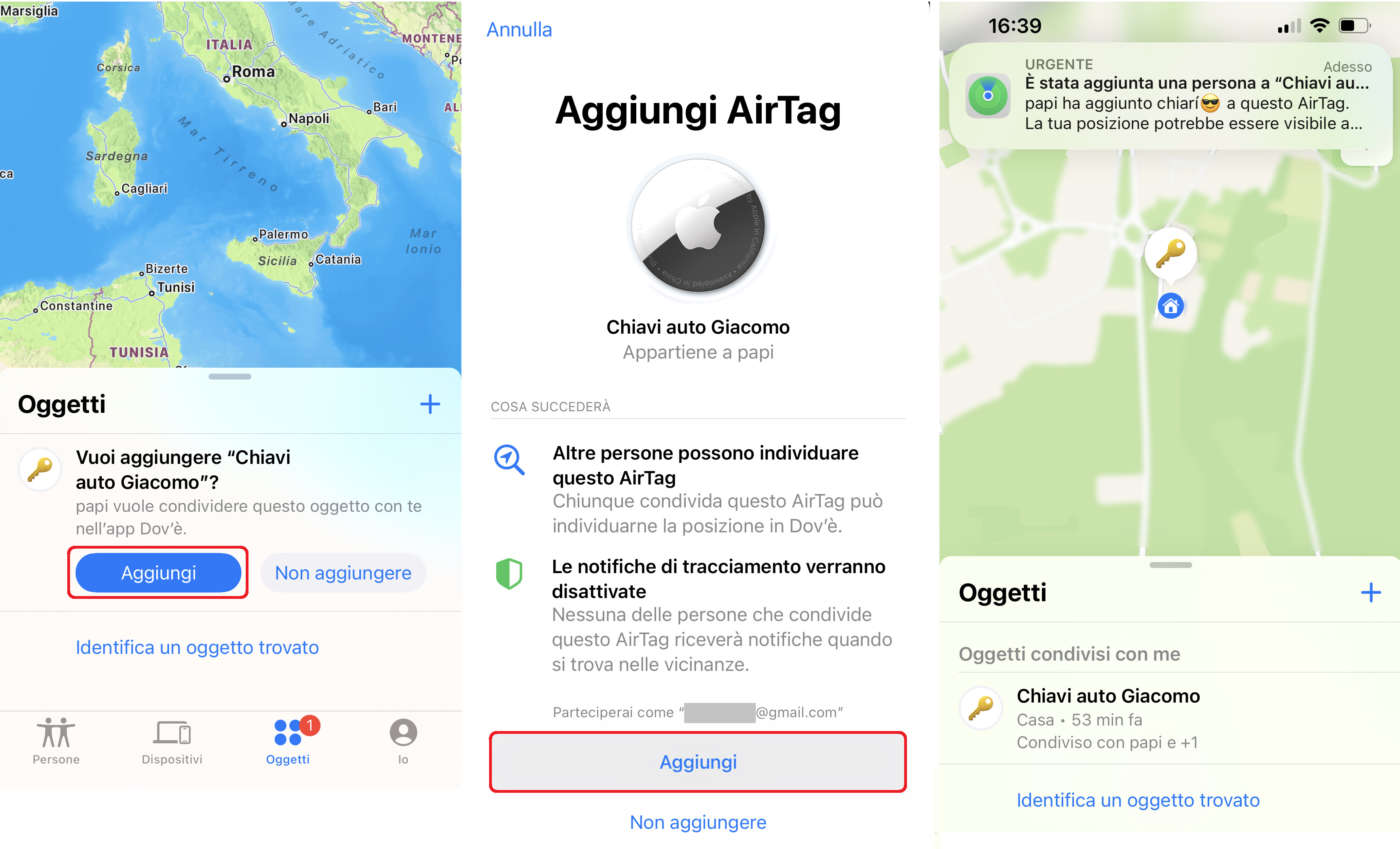 1. Gli invitati riceveranno una notifica di condivisione e, se accettano (click su Aggiungi), potranno vedere il vostro AirTag nel loro pannello Oggetti (Oggetti condivisi con me). Se rifiutano l’invito (click su Non aggiungere) il loro nome verrà rimosso dal vostro elenco.