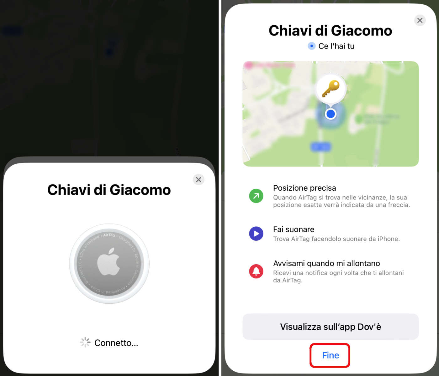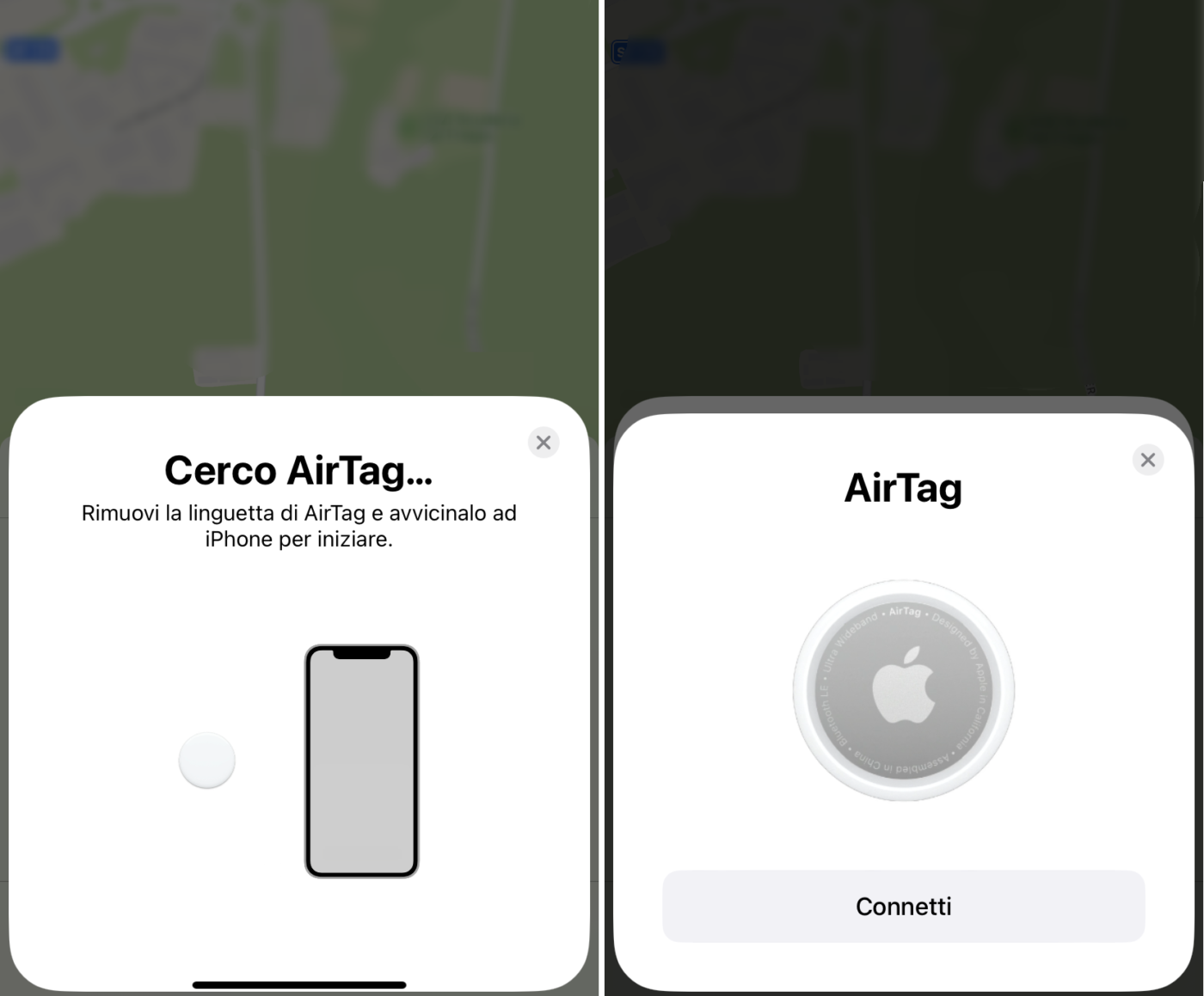 1. Rimuovere la linguetta di protezione della batteria dall’AirTag, tenerlo vicino all’iPhone fino al rilevamento e poi cliccare su Connetti;