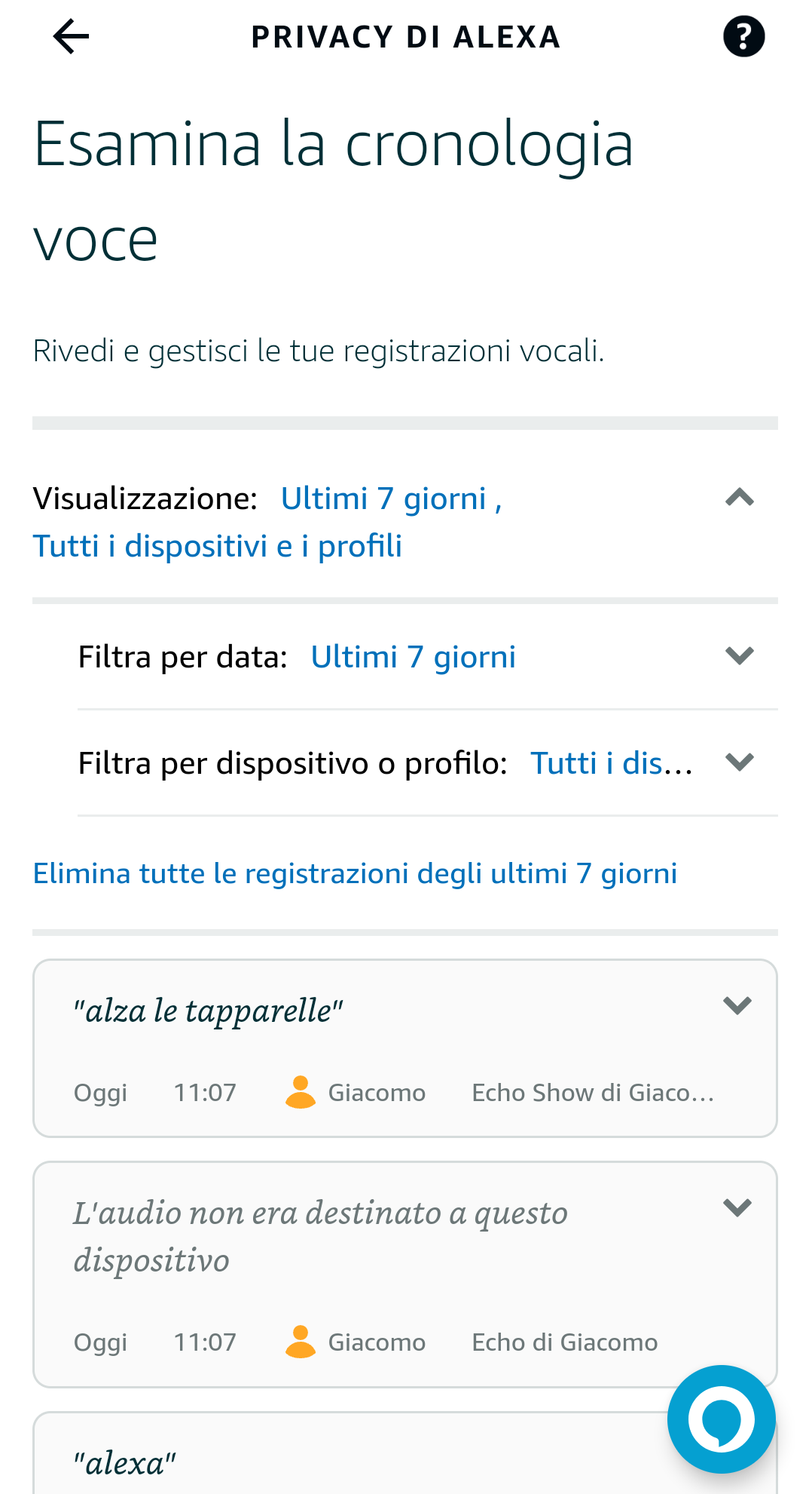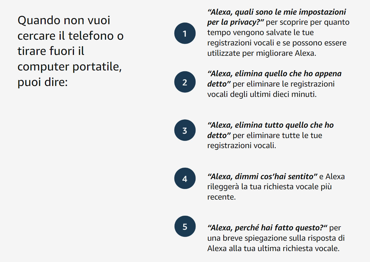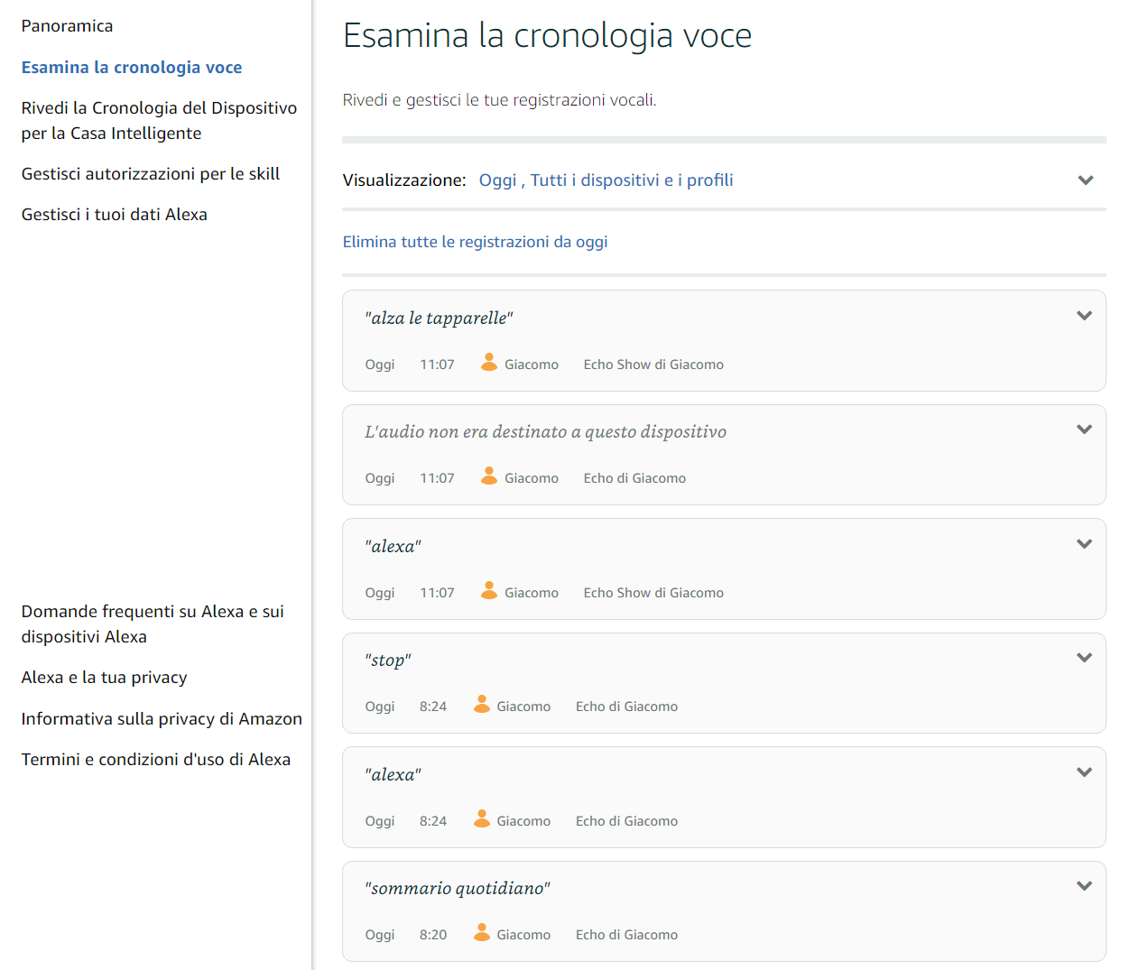 Inoltre, tramite la app, il web e i comandi vocali è possibile sapere tutto ciò che Alexa ha ascoltato, scegliere i comandi vocali da cancellare, mantenere e come devono essere utilizzati (vedi sotto).