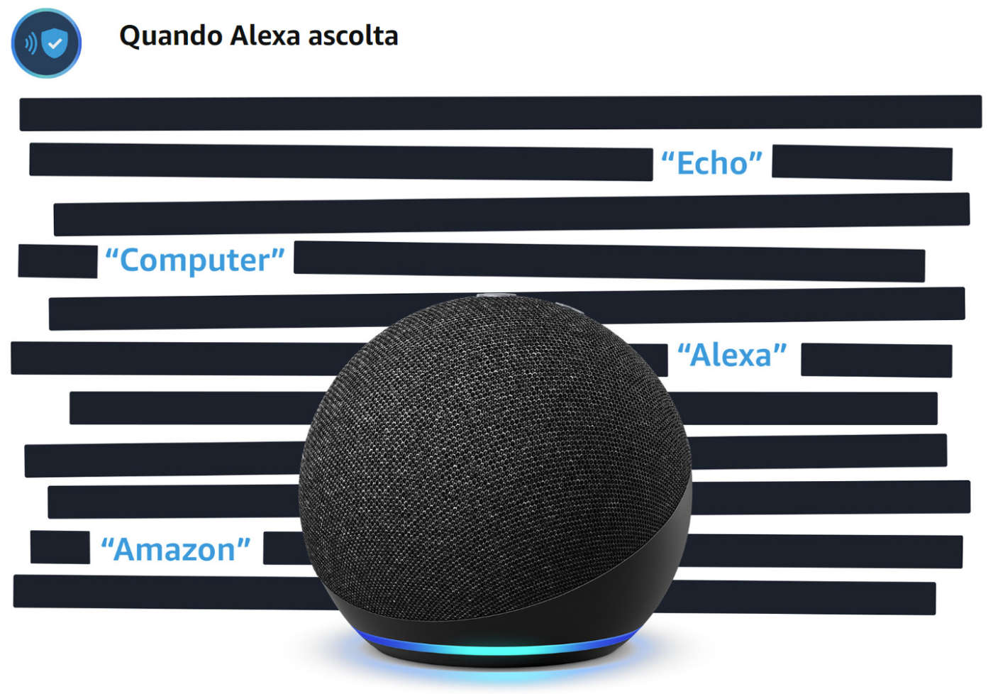 Alexa non ascolta le nostre conversazioni né le registra perché, pur rimanendo sempre in attesa, entra in azione solo dopo aver ascoltato una delle parole di attivazione (Alexa, Echo, Computer oppure Amazon) che possiamo impostare dalla app Alexa (Impostazioni > Impostazioni dispositivo > seleziona dispositivo > Parola di attivazione) oppure dal portale web e che fanno illuminare la striscia led blu dinamica sul dispositivo Echo.