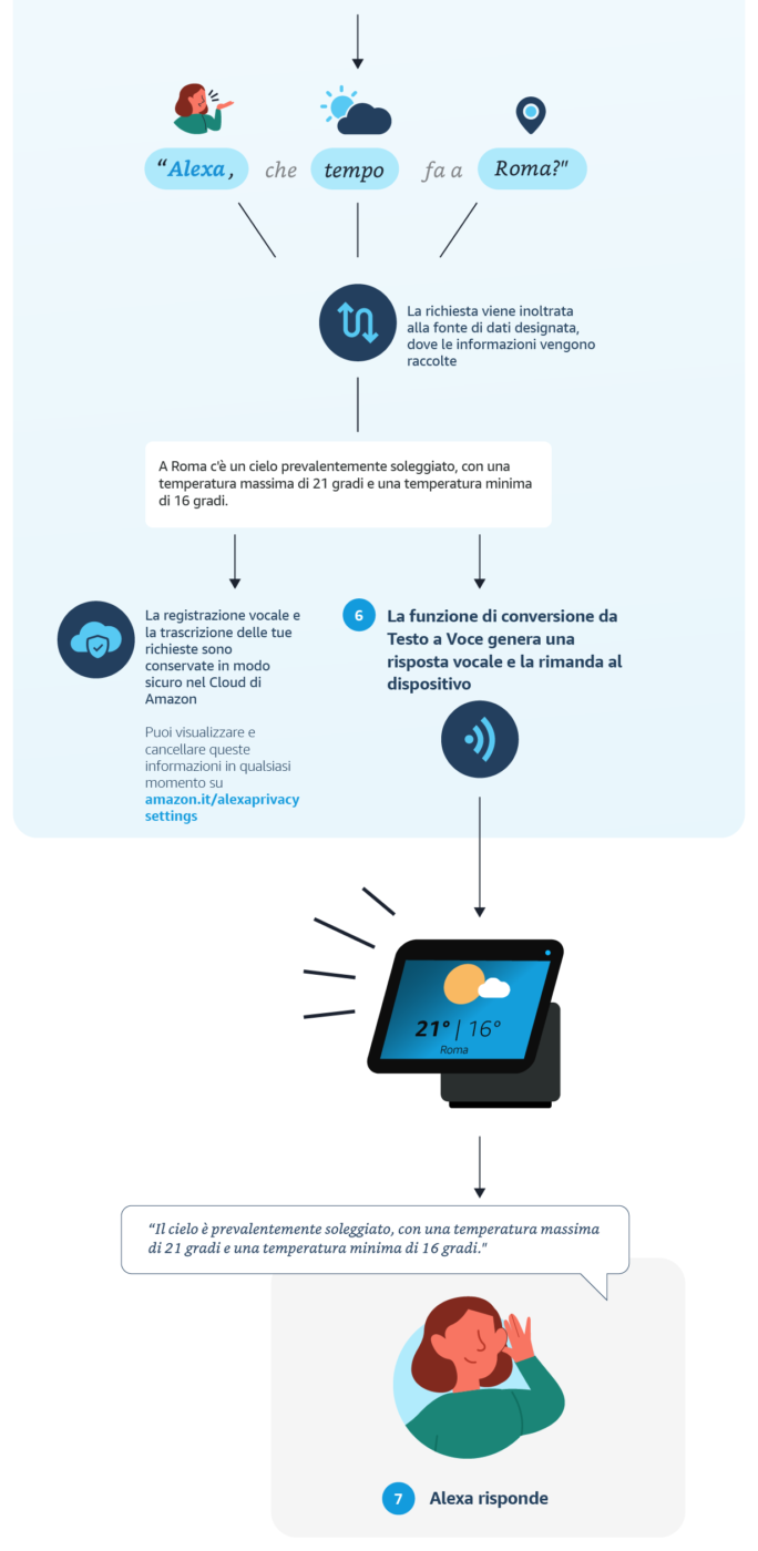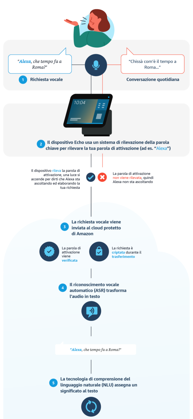 Alexa e la sua app assicurano la massima trasparenza riguardo alla gestione dei comandi vocali pronunciati, rilevati e memorizzati nel dispositivo e sul cloud.