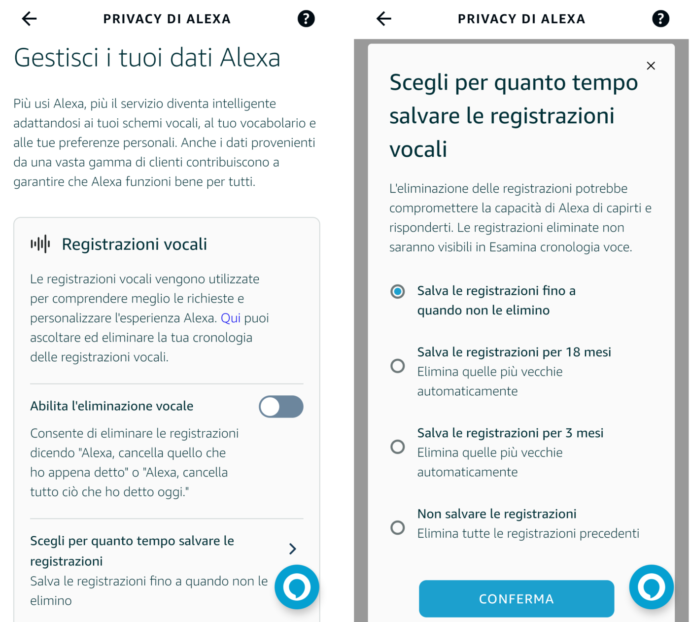 Per eliminare le registrazioni si può anche dire “Alexa, elimina quello che ho appena detto” oppure “Alexa, elimina tutto quello che ho detto oggi”. È possibile anche eliminare le registrazioni tutte insieme o automaticamente, con cadenza regolare, dopo 3 mesi o 1 anno e mezzo così come non salvarle affatto.