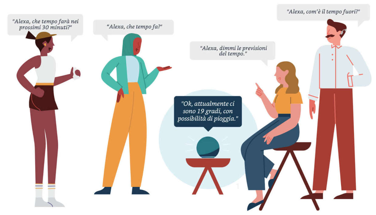 I dati vengono analizzati per insegnare ad Alexa a prendere decisioni o a fare previsioni più accurate. Per esempio, quando chiediamo se fuori piove, Alexa decide che stiamo chiedendo il meteo, mentre quando diciamo “Alexa, metti della musica”, Alexa prevede che genere di musica vogliamo ascoltare in base alle nostre richieste precedenti.