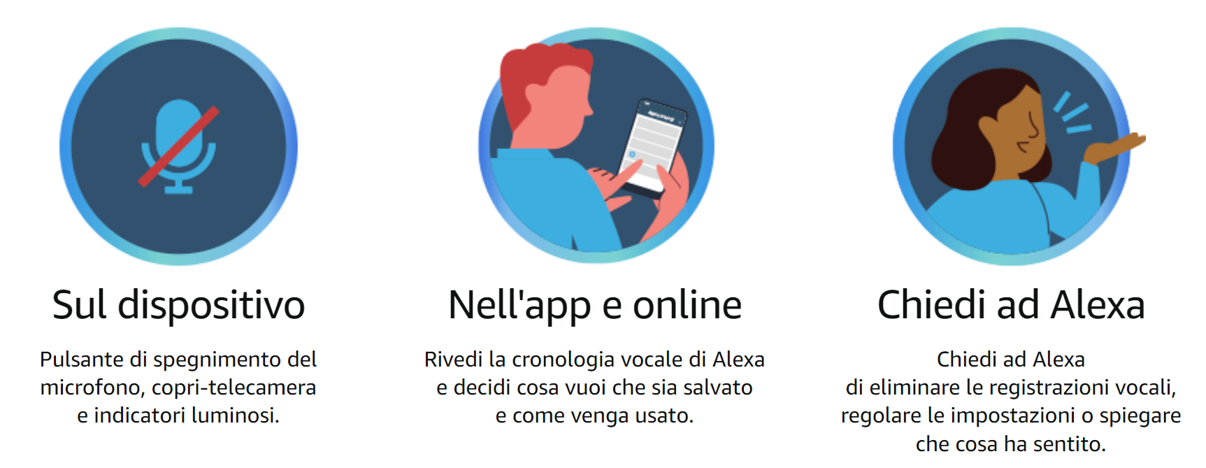Quando Amazon ha progettato Alexa e i dispositivi Echo ha valutato con molta attenzione sia la privacy che la sicurezza di coloro che li utilizzano e dei loro familiari, studiando vari accorgimenti che disattivano a monte i microfoni (tasto MUTE su Echo e Echo Show) e la telecamera integrata nei modelli Echo Show (meccanismo copri-obiettivo).
