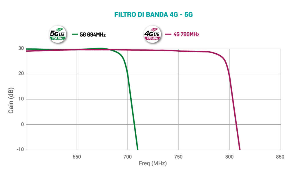 Gli amplificatori da palo e da interno serie T2 sono dotati di uno switch 4G/5G che consente la selezione del filtraggio in base alle eventuali interferenze causate dai ripetitori telefonici; questa condizione può rendersi necessaria quando tra il sistema d’antenna e la stazione di trasmissione è presente un emittente per i servizi mobile: la posizione 4G va utilizzata in presenza di interferenti a frequenze superiori a 790 MHz, mentre la posizione 5G sarà utile con interferenze nella banda 703-790 MHz.