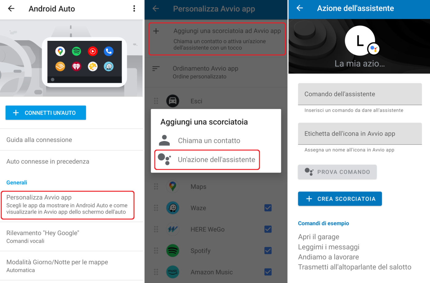 Digitate il comando dell’assistente (es.: Apri il cancello elettrico), assegnate un nome all’icona in Avvio app (es.: Apricancello), provate il comando e, se funziona, cliccate su “+ CREA SCORCIATOIA” per aggiungere l’icona Apricancello nell’elenco delle app di Android Auto. A questo punto basta toccare l’icona per inviare il comando al dispositivo smart.