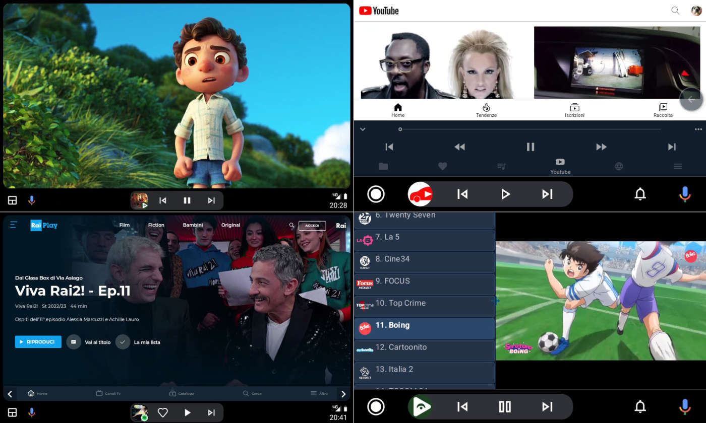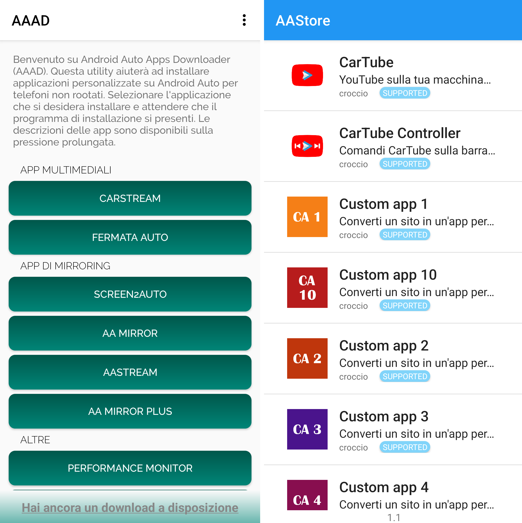 Queste due app fungono da “sideloader”, ovvero da tramite per il caricamento di altre app “non ufficiali” come CarTube (YouTube), Fermata Auto (app multimediale e multifunzione per riprodurre video AVI/MP4/MKV e YouTube, canali IPTV, siti web, ecc.) e le Custom App 1…10 che trasformano qualsiasi sito web (anche VOD come Netflix, Prime Video, RaiPlay, ecc.) in una app accessibile da Android Auto.