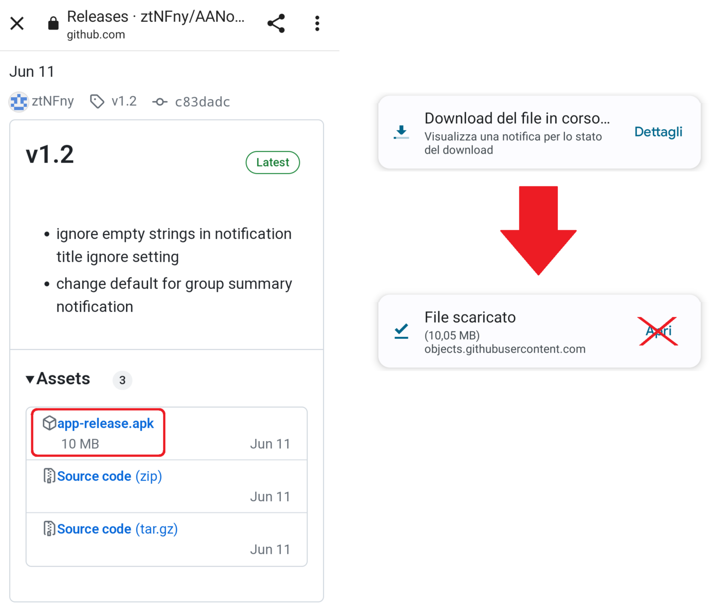 - Salvate il file nella memoria dello smartphone (es.: cartella Download) ma NON INSTALLATELO;