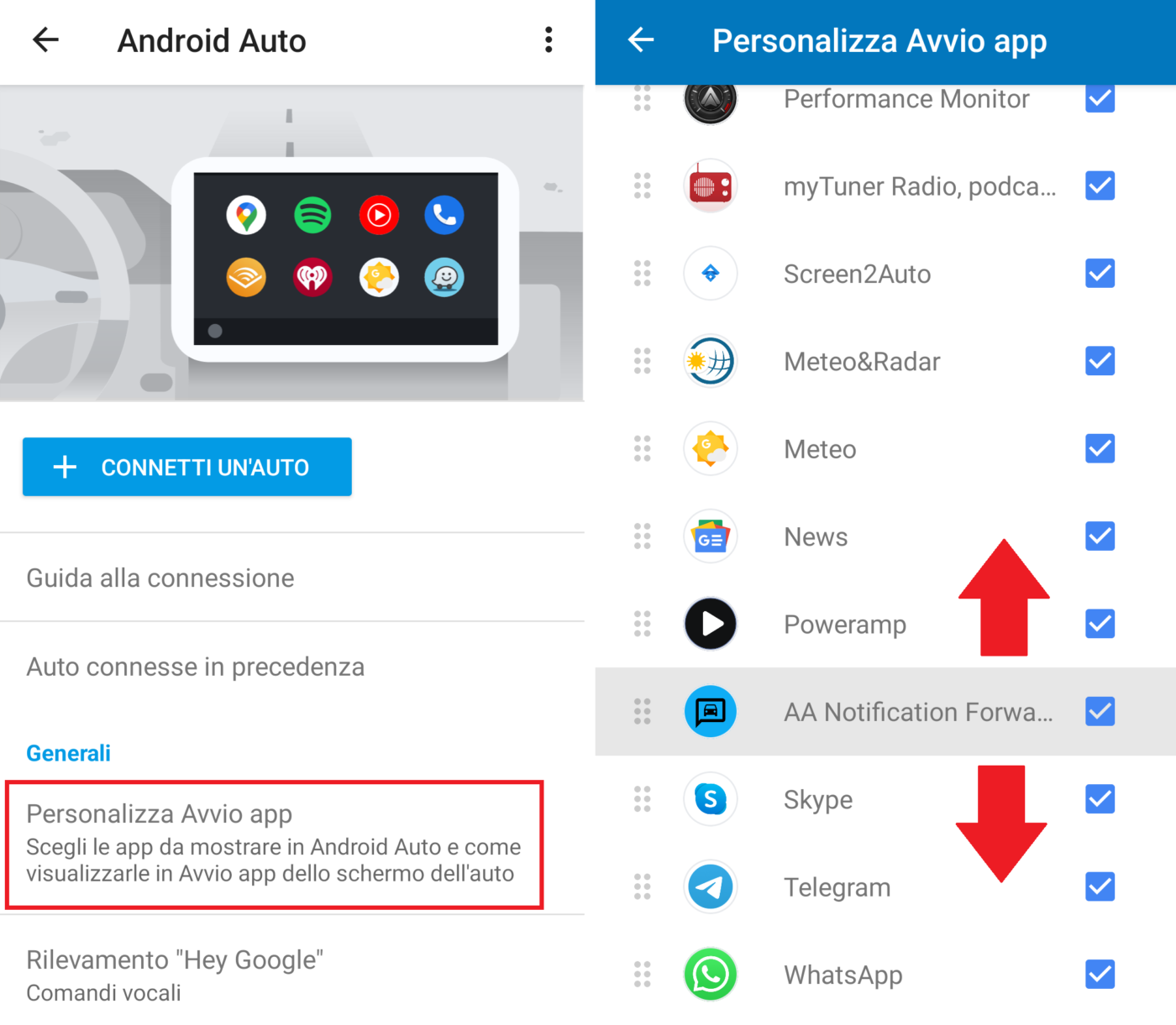 - Al termine dell’installazione la app comparirà sia nell’elenco dello smartphone (drawer) sia in quello di Android Auto con la possibilità, per quest’ultimo, di modificare l’ordinamento dai settaggi di Android Auto (da Android 10 in poi) o dalla app Android Auto (Personalizza avvio app > scorrere l’elenco > spuntare la app e trascinarla in alto o in basso);