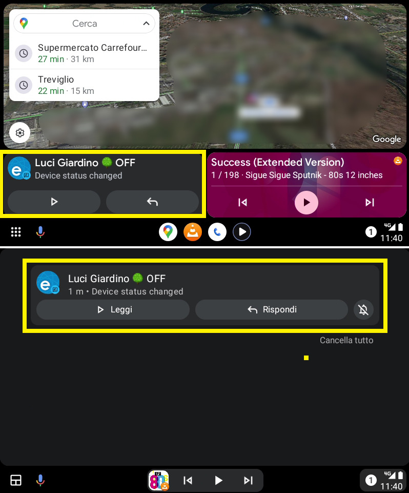 Le notifiche vengono mostrate sulla schermata principale di Android Auto esattamente come quelle “native” (es.: WhatsApp o Telegram), ovvero con un pop-up a tendina o nel box dedicato a meteo e notifiche.