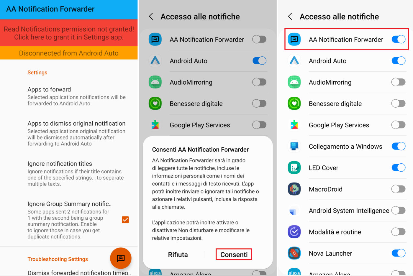 Per ricevere le notifiche anche su Android Auto basta aprire la app sullo smartphone, consentirgli l’accesso alle notifiche e poi selezionare le app che possono inviare le notifiche (App to forward).