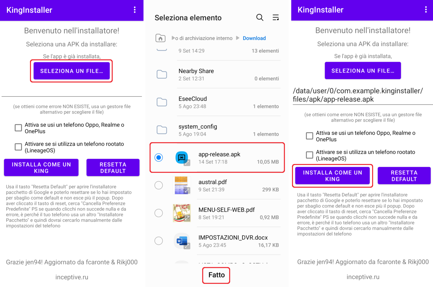 - Lanciate la app KingInstaller, cliccate su “SELEZIONA UN FILE…”, cercate il file apk che avete appena salvato nella memoria dello smartphone download), selezionatelo e cliccate su “fatto”;