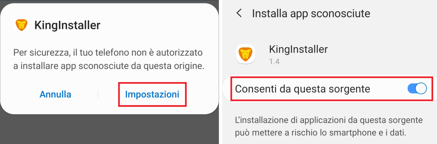 - Se possedete uno smartphone Oppo, Realme o OnePlus dovete spuntare anche la relativa casella e poi cliccare su “INSTALLA COME UN KING” per installare l’applicazione. Prima di avviare l’installazione vi verrà richiesto di autorizzare l’installazione di app sconosciute da KingInstaller (vedi schermata qui sotto);