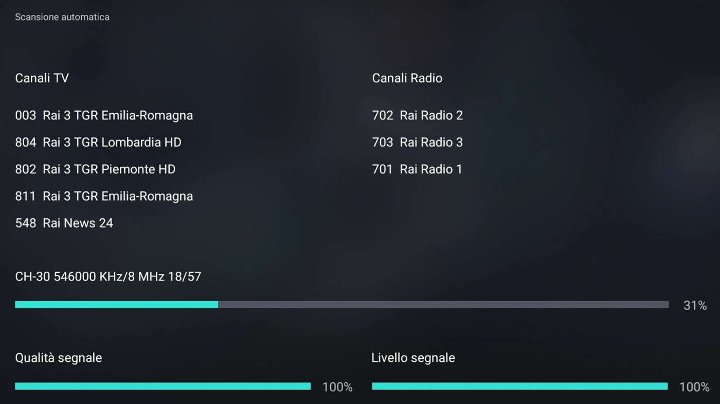 Seguite la procedura sullo schermo del TV selezionando le voci richieste (es.: lingua menu/audio, paese, LCN, ecc.), attendete la scansione dei canali (circa 2-3 minuti) e, al termine, selezionate il canale desiderato in caso di conflitto di numerazione LCN (es.: Rai 3 Lombardia sul canale 3).