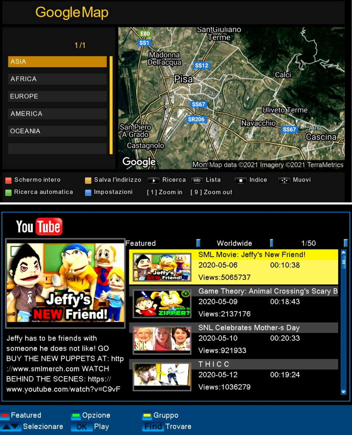 È dotato di due telecomandi per il controllo del solo decoder (no Tv): il primo è di tipo completo mentre il secondo è semplificato con pochi tasti per le sole funzioni essenziali. Da segnalare anche i servizi online con collegamento via cavo Ethernet o Wi-Fi (con dongle opzionale). Clicca qui per scaricare e leggere il manuale d’uso.