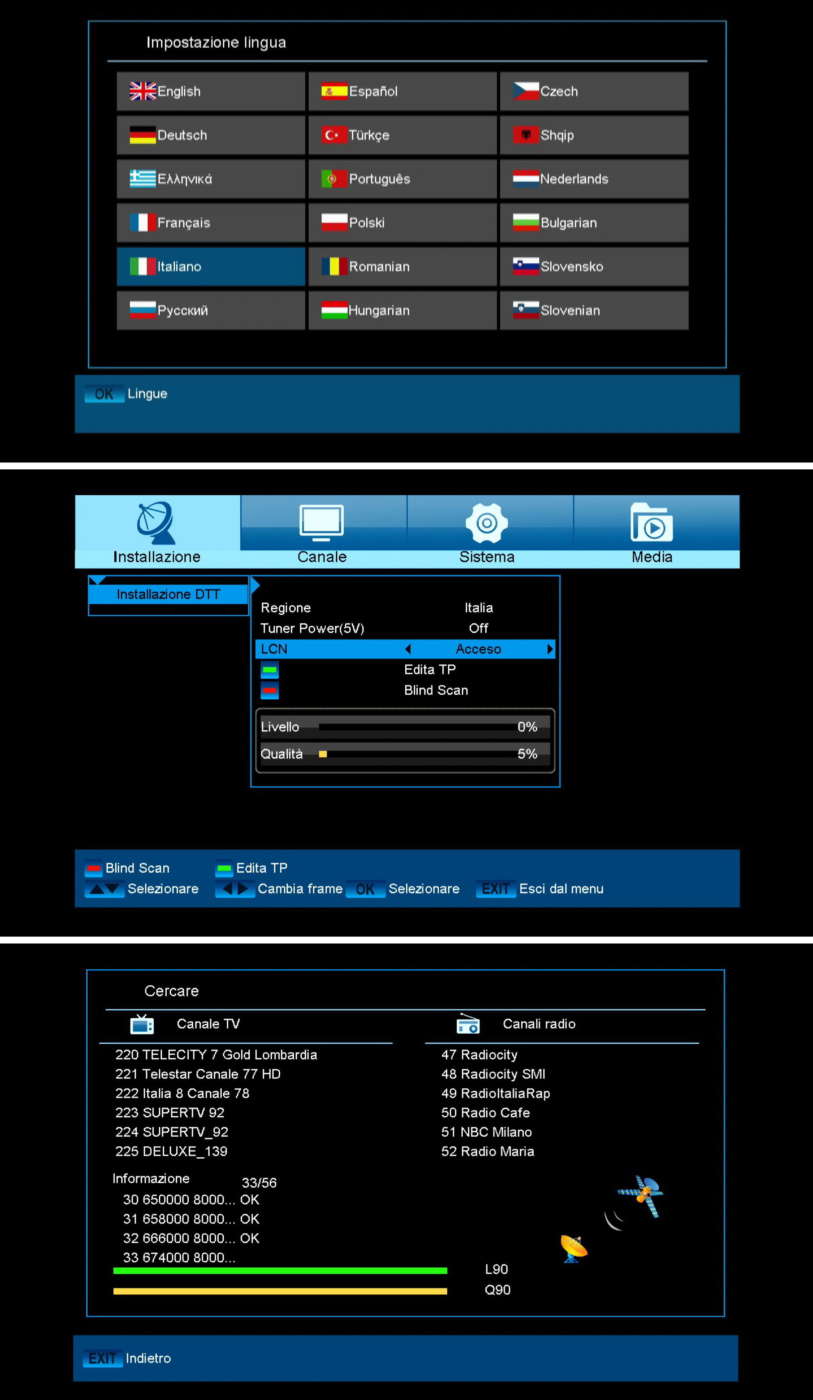 Completato anche questo passaggio il decoder è pronto e potete fare zapping oppure impostare le altre opzioni del menu (aggiornamento automatico, video/audio, funzioni extra, ecc.) utilizzando come riferimento il manuale d’uso in dotazione.