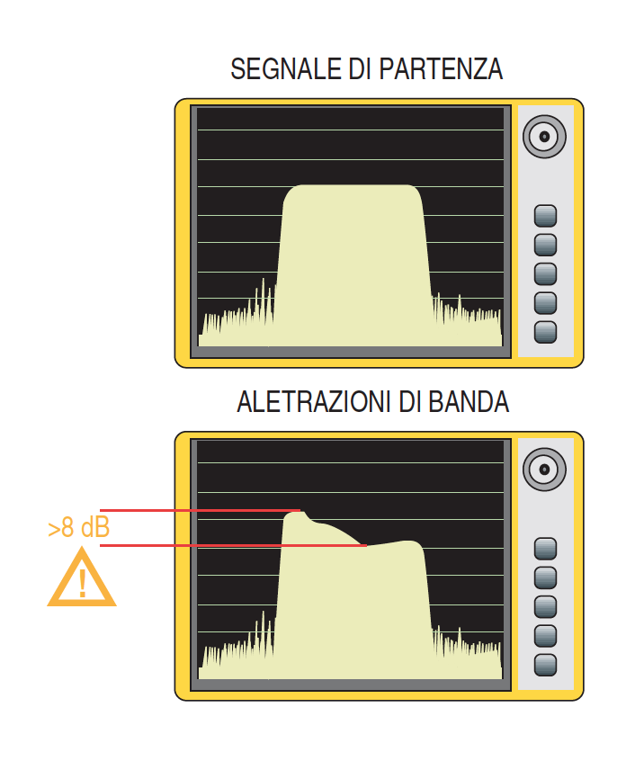 Tale “panettone” rispetto alla forma ideale può presentare alterazioni che modificano la “cresta” ovvero l’andamento del livello massimo che, secondo le norme, può avere variazioni massime di 8 dB per tutti i segnali digitali DVB: T, T2, S, S2. Le “alterazioni della banda”, ovvero della forma del canale, sono influenzate da fenomeni che si manifestano in ricezione, già in antenna, o da difetti della rete di distribuzione.