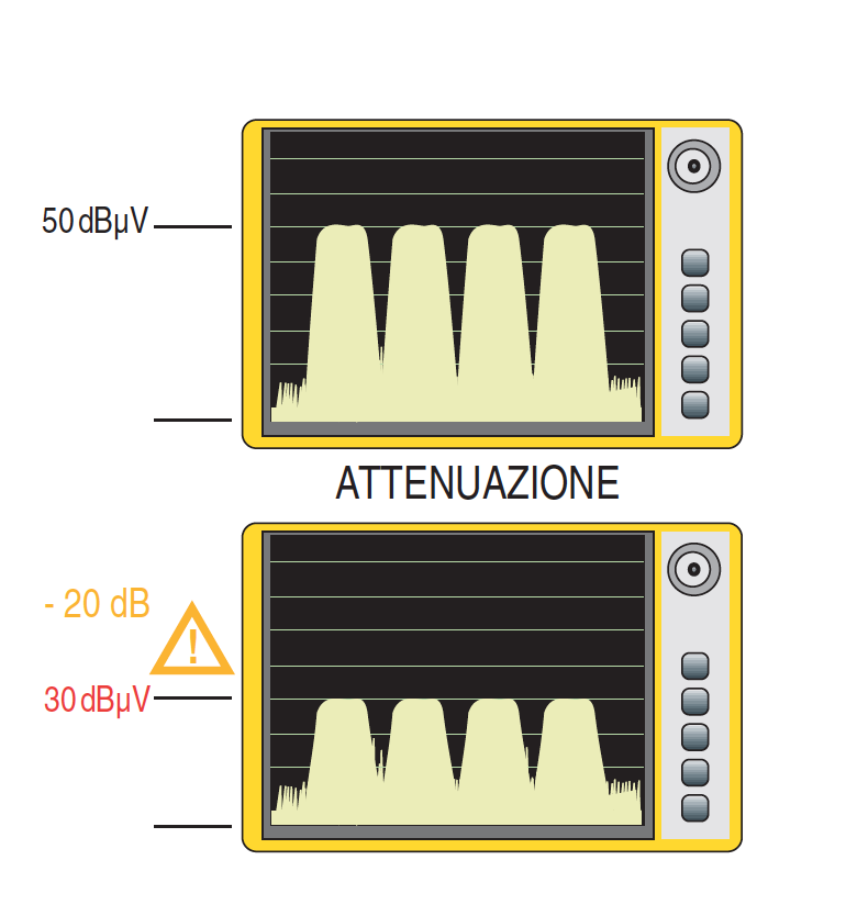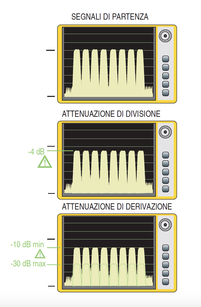 Tutti i segnali trasmessi via etere e trasportati da cavi coassiali, subiscono una riduzione di energia che produce un abbassamento della tensione utile del segnale definito come “attenuazione”. La distanza in aria che separa l’antenna trasmittente dall’antenna ricevente produce “attenuazione di tratta”; la lunghezza dei cavi coassiali usati per trasferire i segnali ricevuti dalle antenne alla centrale di testa comporta “attenuazione di collegamento”; la lunghezza dei cavi coassiali usati nella rete di distribuzione e i dispositivi passivi (divisori e derivatori) inseriti nella rete per creare i rami di distribuzione diretti alle prese TV-SAT dell’impianto producono “attenuazione di distribuzione” che può essere di “divisione” o di “derivazione”; il cavo coassiale collegato a una presa TV-SAT e diretto al nostro decoder TV-SAT, introduce anch’esso una “attenuazione di collegamento”.