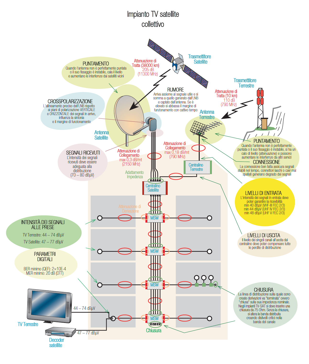 Può essere utile, prima di affrontare l’analisi delle cause di una ricezione problematica, conoscere come è strutturata la catena di trasmissione-ricezione dei diversi segnali che arrivano nelle nostre case. Analizzando il percorso che il segnale da ricevere compie, partendo dal trasmettitore fino alla presa del nostro TV o decoder SAT, possiamo constatare che tale segnale può subire azioni degradanti in più punti del percorso: via etere (attenuazione e interferenze), in antenna (stato non ideale del fissaggio, dell’orientamento, della connessione), in testa alla distribuzione (funzionamento non corretto dell’amplificatore di testa o centralino TV-SAT), nella rete di distribuzione e di utente (perdite per invecchiamento dei cavi o per difetti di connessione, alterazioni della banda per disadattamenti di impedenza), nell’impianto di utente (difetti di connessione o modifiche fatte senza criterio in vecchi impianti con linea di distribuzione principale passante negli appartamenti).