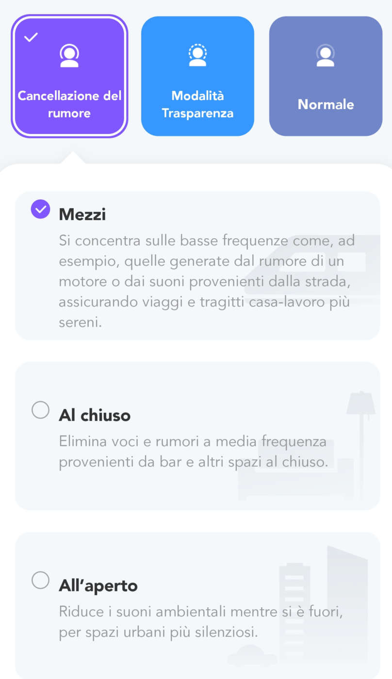 Questi preset agiscono in modo differente sui vari tipi di rumore come quelli del traffico e dei mezzi di trasporto (basse frequenze), le voci di ambienti interni come bar e palestre oppure i suoni ambientali esterni (es.: pioggia, vento, ecc.) così da ottimizzarne la cancellazione.