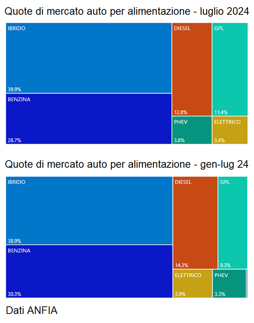 Le vetture ibride non ricaricabili hanno registrato un +17,4% nel mese con una quota del 39,9%. Nel cumulato crescono del 15,8% con una quota del 38,9%. Le ibride ricaricabili e quelle elettriche pure rappresentano solamente il 7,2% del mercato del mese e del cumulato con una quota quasi identica (3,3%-3,8% per le ibride plug-in e 3,4%-3,9% per le elettriche).