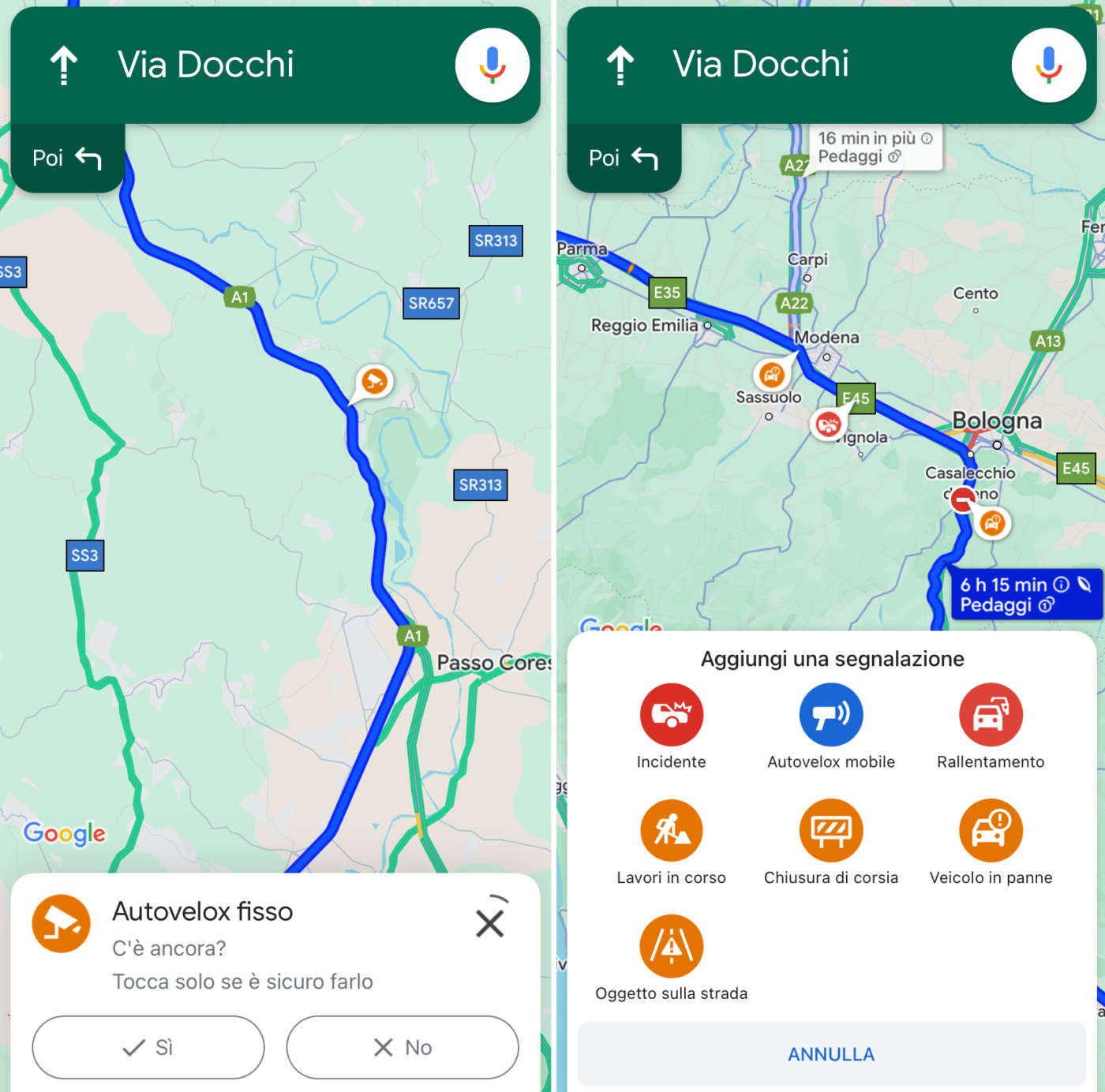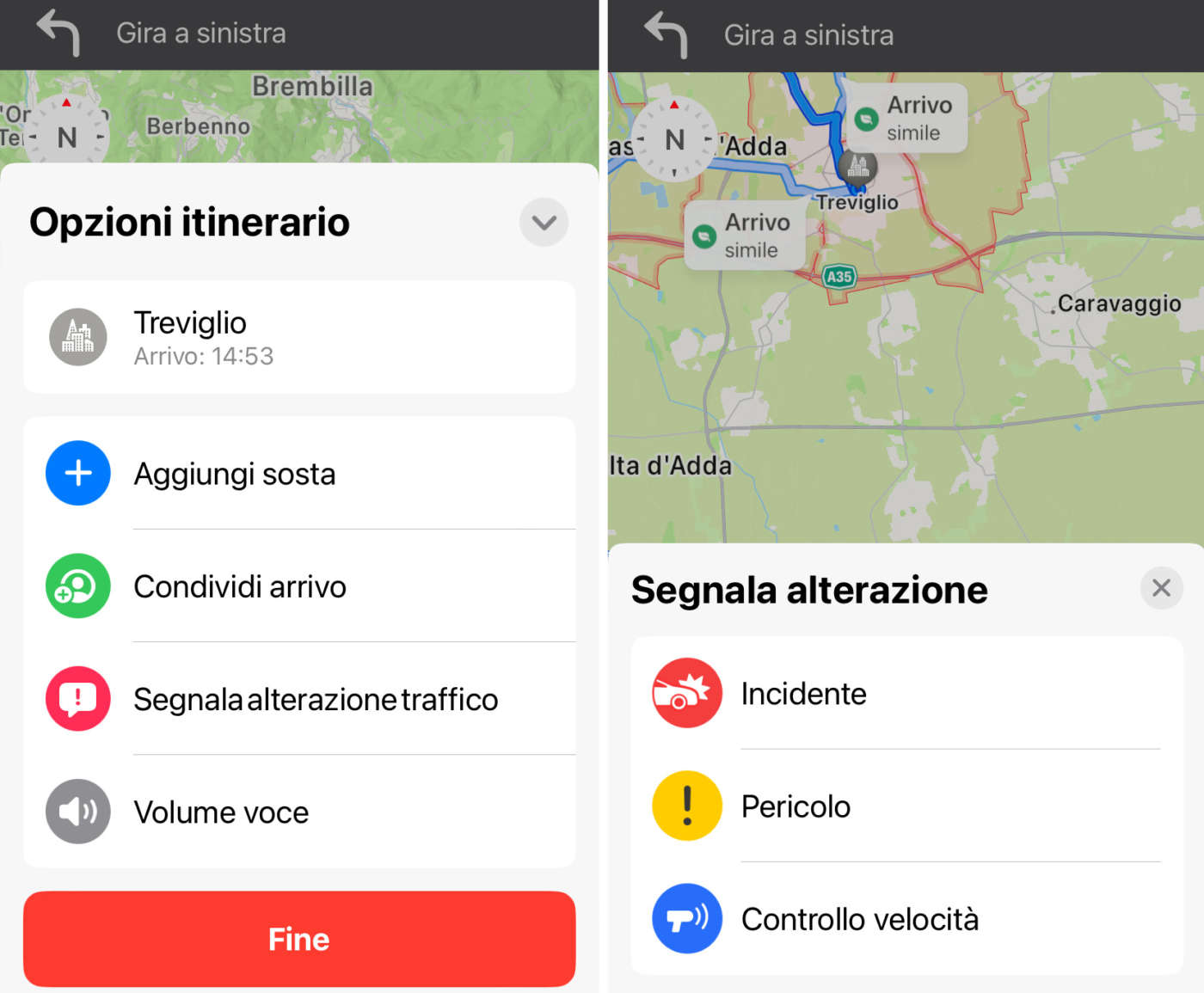Mappe supporta anche le segnalazioni degli utenti sulla presenza di autovelox non riportati sulla cartografia: basta sollevare la barra menu in basso, cliccare su Segnala alterazione traffico e poi su Controllo velocità.