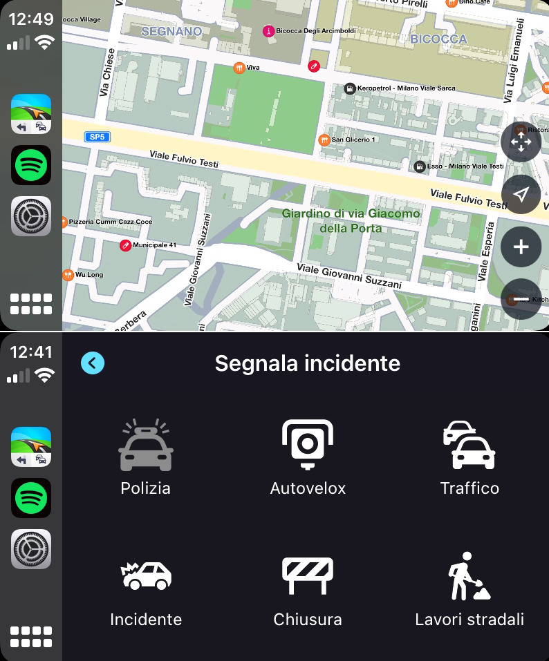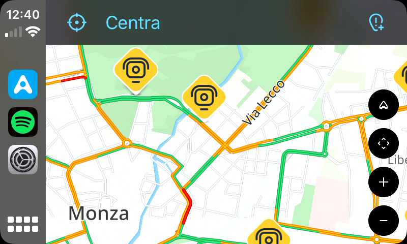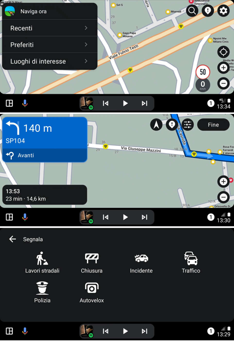 Le versioni Android Auto e CarPlay sono altrettanto funzionali e intuitive grazie alla finestra di ricerca libera, agli avvisi autovelox, photored, tutor e altri (se abilitati sulla app come spiegato sopra), al tasto Segnala (velox, lavori in corso, ingorghi, ecc.), al tachimetro (con i limiti di velocità), ecc.