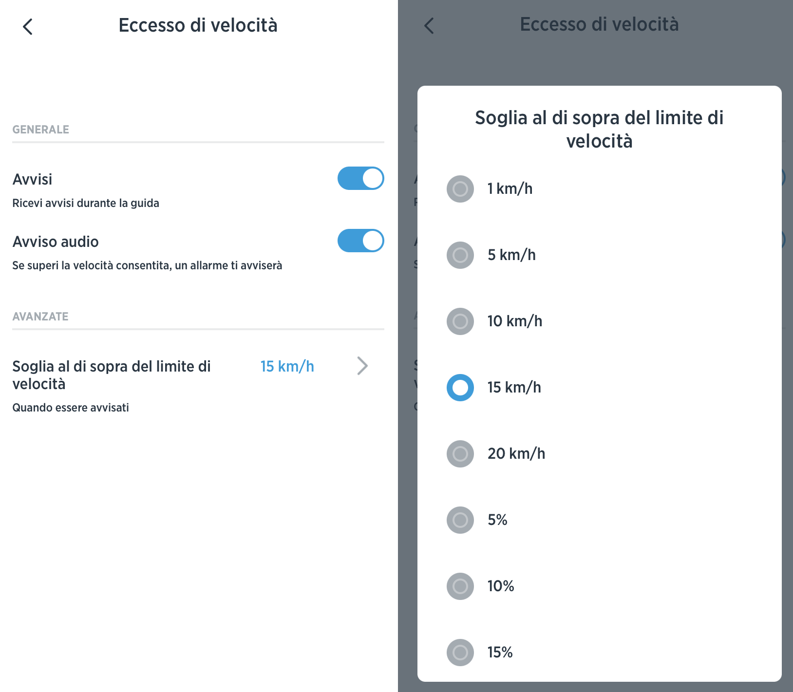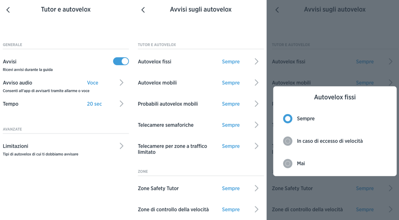 Cliccate sui singoli avvisi (tutor e autovelox, pericoli ed eccesso di velocità), abilitate gli avvisi durante la guida, scegliete la tipologia (voce o allarme), la tempistica (10, 20 o 30 secondi prima della posizione effettiva) e i dispositivi come autovelox fissi-mobili, photored, ZTL, zone tutor e controllo velocità dei quali volete ricevere gli avvisi (sempre, solo in caso di superamento dei limiti di velocità oppure mai).