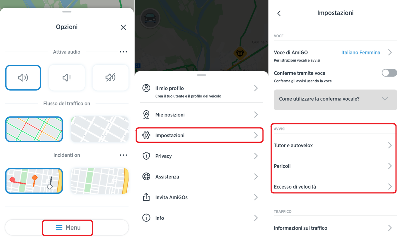 Per attivare e configurare gli avvisi di presenza autovelox, tutor e limiti di velocità basta cliccare sui tre puntini in basso a destra (accanto alla finestra di inserimento della destinazione), poi su Menu, Impostazioni e Avvisi.