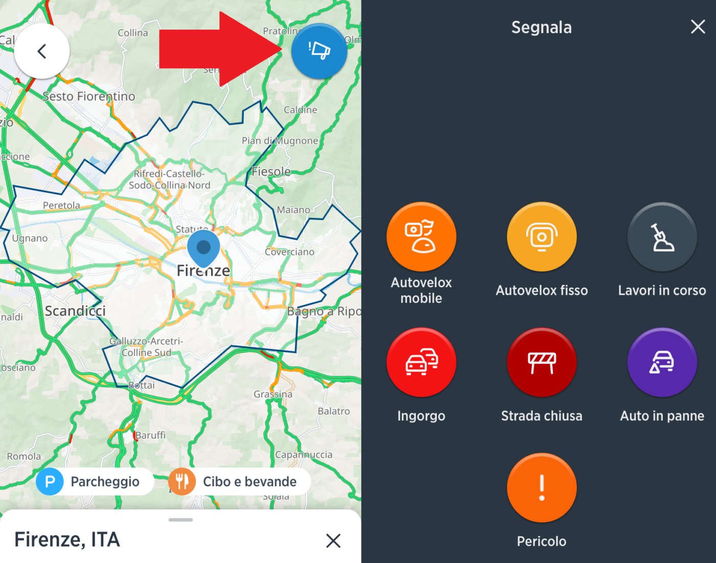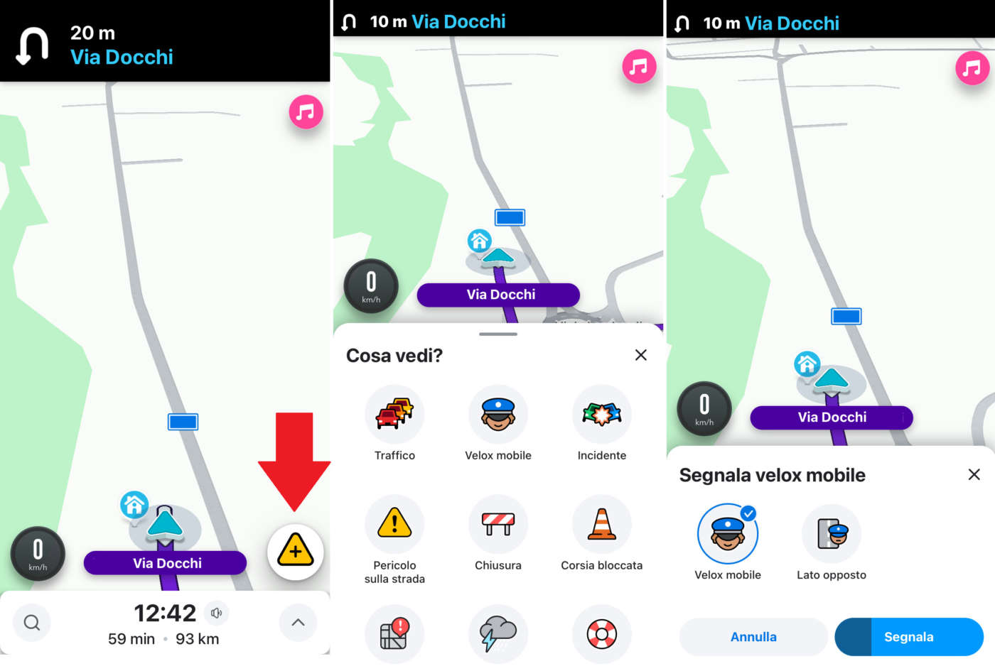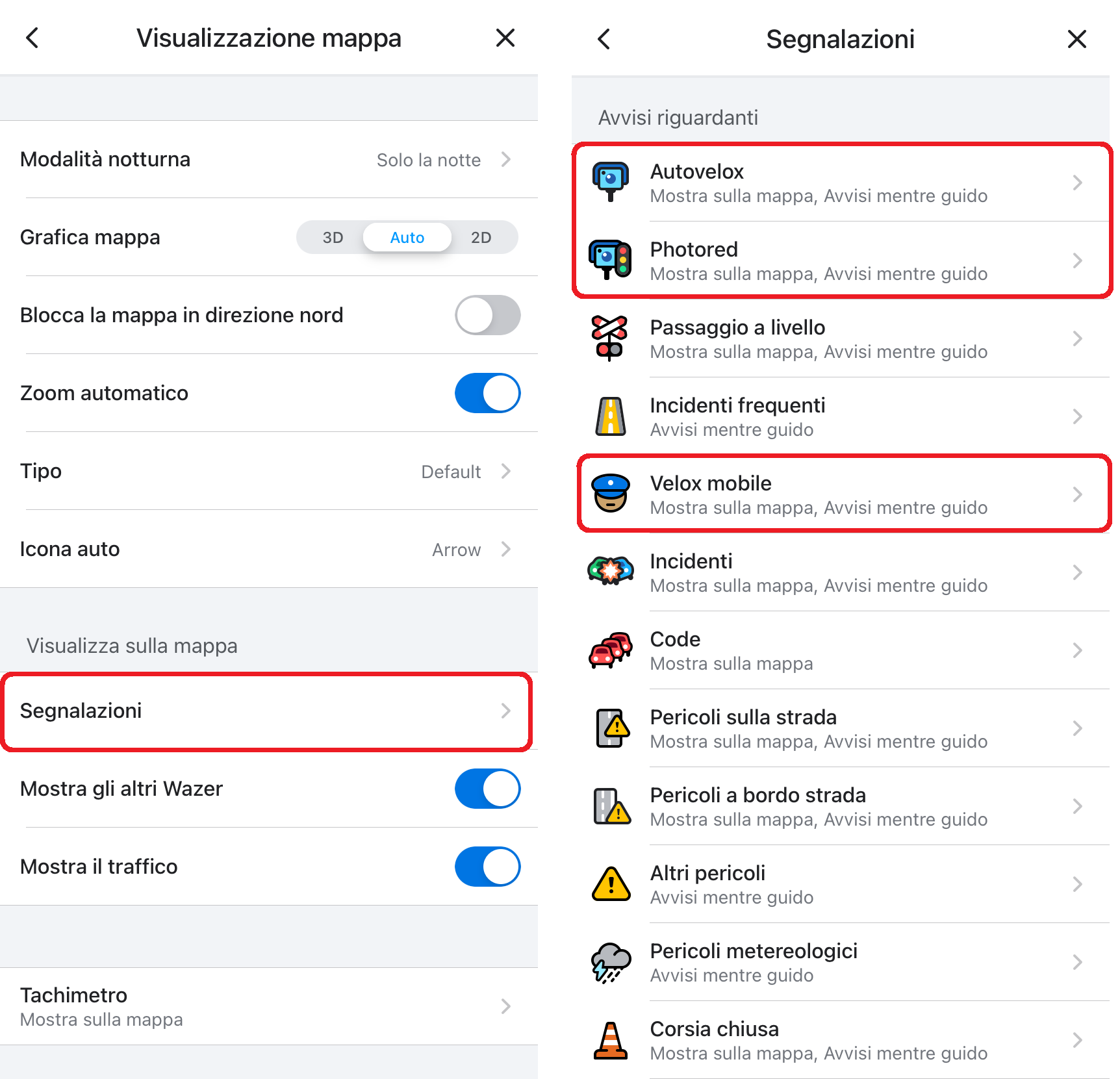 Per abilitare le icone sulla mappa e gli avvisi vocali basta cliccare sulla barra menu in alto a sinistra (tre linee orizzontali), poi su Impostazioni, Visualizzazione mappa, Segnalazioni e cliccare sul tipo di avviso (autovelox, photored, velox mobile, ecc.).