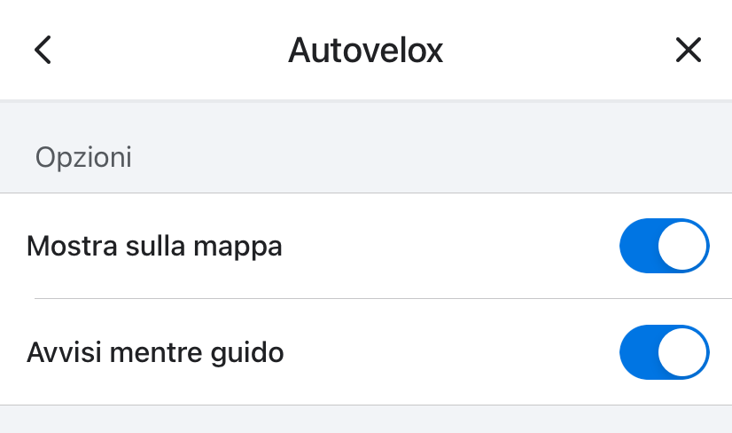 Per ogni singola tipologia di segnalazione è possibile attivare l’icona sulla mappa e/o l’avviso durante la guida.
