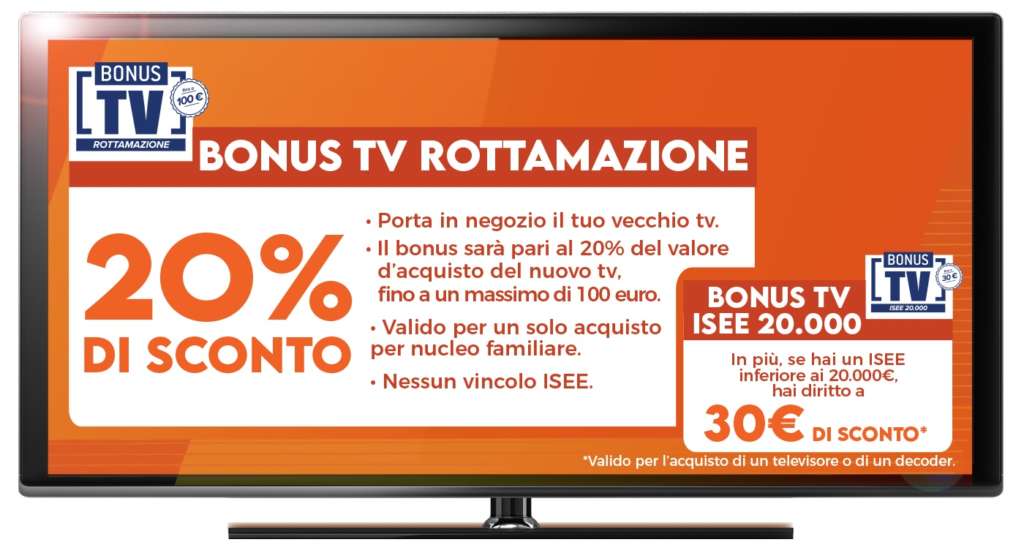 Dal 23 agosto si può richiedere il nuovo Bonus Rottamazione TV per acquistare un nuovo televisore con la rottamazione di quello vecchio. Viene calcolato sul prezzo comprensivo di IVA (20% fino a un massimo di 100 euro), è disponibile per tutti i residenti in Italia abbonati al canone Tv (anche se esentati per limiti di età) e senza limiti di reddito. Si può cumulare con il Bonus TV-decoder che scende da 50 a 30 euro per uno sconto complessivo di ben 130 euro.