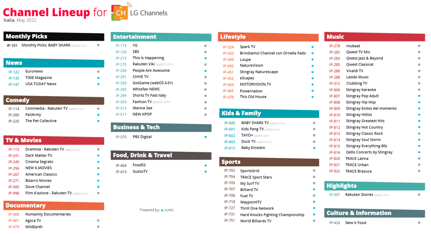 I canali IPTV disponibili su LG Channel vengono costantemente aggiornati e modificati, anche su richiesta degli stessi clienti LG. La lista aggiornata è scaricabile in PDF da qui: secondo l’ultimo aggiornamento di maggio 2022, comprende un’ottantina di canali tematici principalmente in lingua inglese ma con qualche presenza italiana interessante.