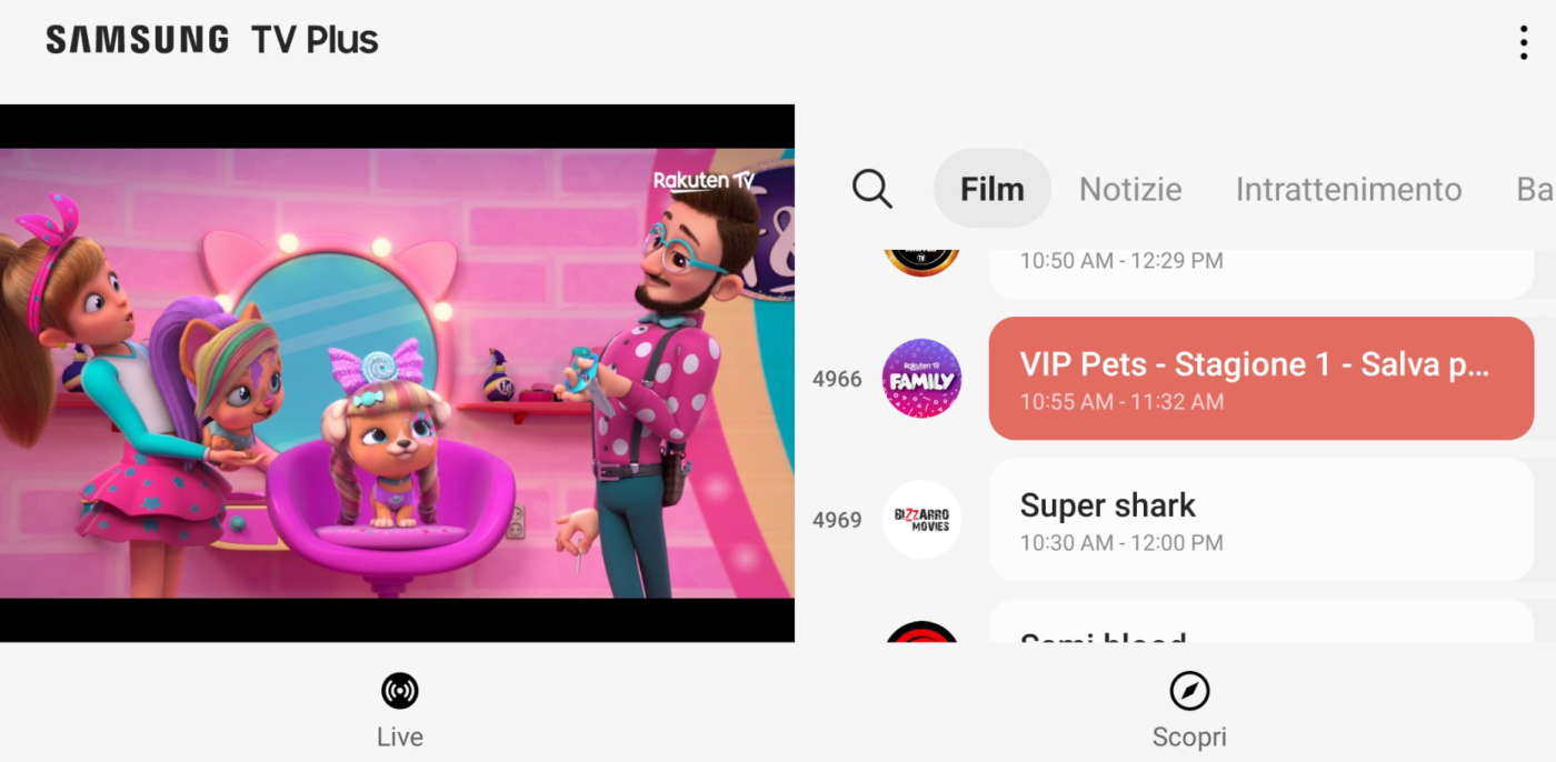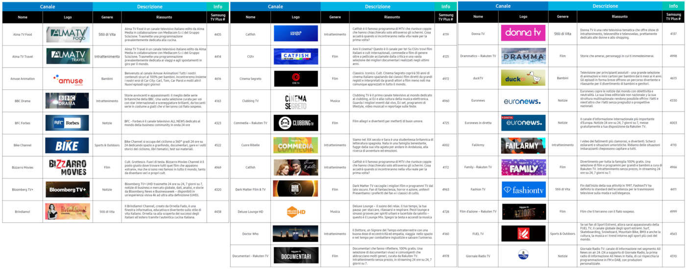 Samsung TV Plus comprende una settantina di canali televisivi in streaming che spaziano dall’informazione allo sport, dal cinema all’intrattenimento per tutta la famiglia (bimbi compresi), dai viaggi alla cucina. L’elenco completo ed aggiornato è disponibile qui oppure cliccando il pulsante “scopri i nostri canali” dalla home page web del servizio.
