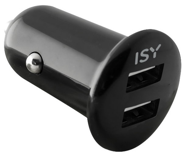 Caricatore USB a marchio ISY (brand di Mediaworld) con due porte USB-A da 2,4 ampere per la ricarica rapida di smartphone, cellulari e altri dispositivi alimentati via USB. Le dimensioni ridotte permettono di inserirlo quasi totalmente nelle prese accendisigari mentre il collare pronunciato facilita la rimozione. Pur essendo un modello di fascia low-cost svolge il suo lavoro egregiamente.