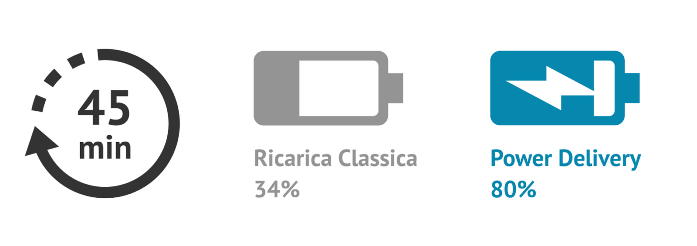 La porta USB-C principale è di tipo PD 3.0 ed eroga una potenza massima di 96 watt (tipica 65 watt) per la ricarica di un MacBook Pro in 39 minuti (0-50%). La seconda USB-C è adatta a smartphone, tablet e powerbank (30 watt massimi). È possibile utilizzare entrambe le USB-C per caricare iPad e iPhone 12-13-14-15 in 30-40 minuti (0-50%).