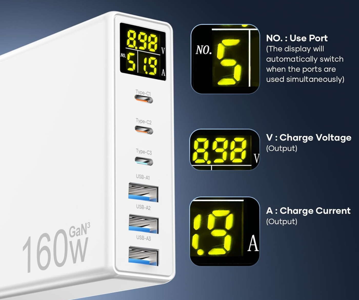 Elemento peculiare è il display led che indica, per ogni singola porta attiva, la tensione di lavoro e la corrente erogata, utile per tenere sotto controllo il ciclo di carica e il consumo energetico dei dispositivi collegati.