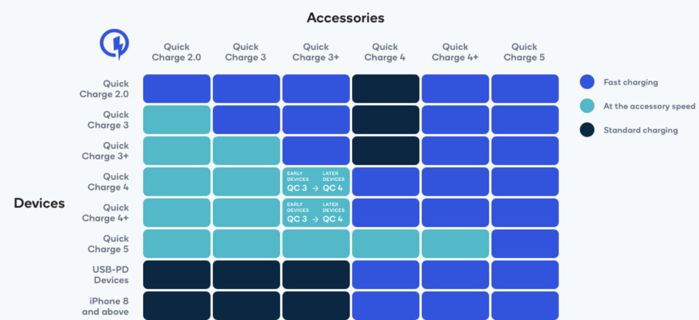 Mentre lo standard USB “di base” impiega solo la tensione di 5 volt per alimentare i dispositivi e ricaricare le batterie, la QC impiega anche voltaggi superiori come 9 e 12 volt (fissi) o da 3,6 a 20 volt (variabili) ad amperaggi più bassi (1,5A-2A) per migliorare l’efficienza energetica, ridurre i tempi di ricarica e l’eccessivo riscaldamento del dispositivo.