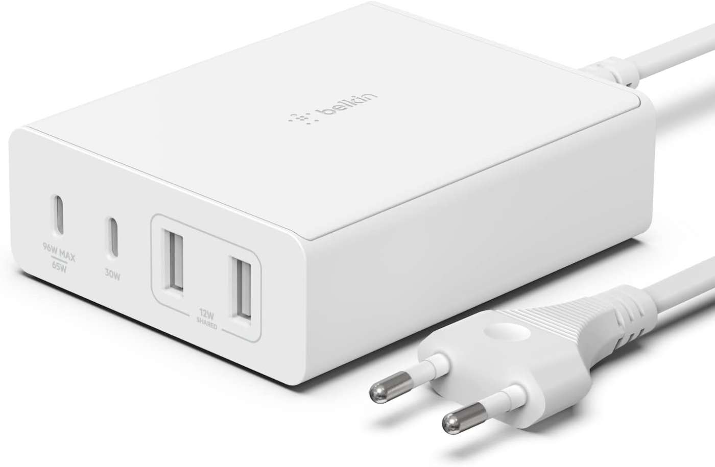 Stazione di ricarica Belkin BoostCharge Pro con due porte USB-C ed altrettante USB-A per una potenza complessiva di 108 watt condivisa in modo intelligente dai dispositivi collegati.