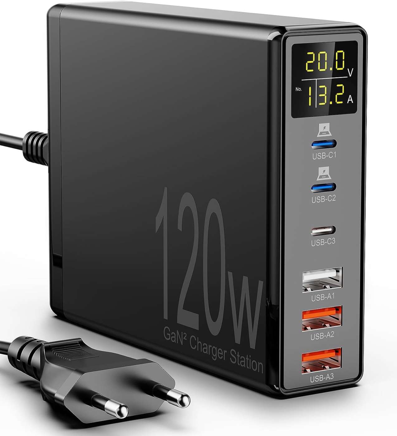 Tower-charger USB GaN da 120 watt complessivi con tre porte USB-C (due PD 3.0 da 65 watt ed una PD da 12-30 watt) e altrettante USB-A QC (max 18 watt per porta, 36 watt complessivi) compatibili con notebook, tablet, smartphone, powerbank, ecc.